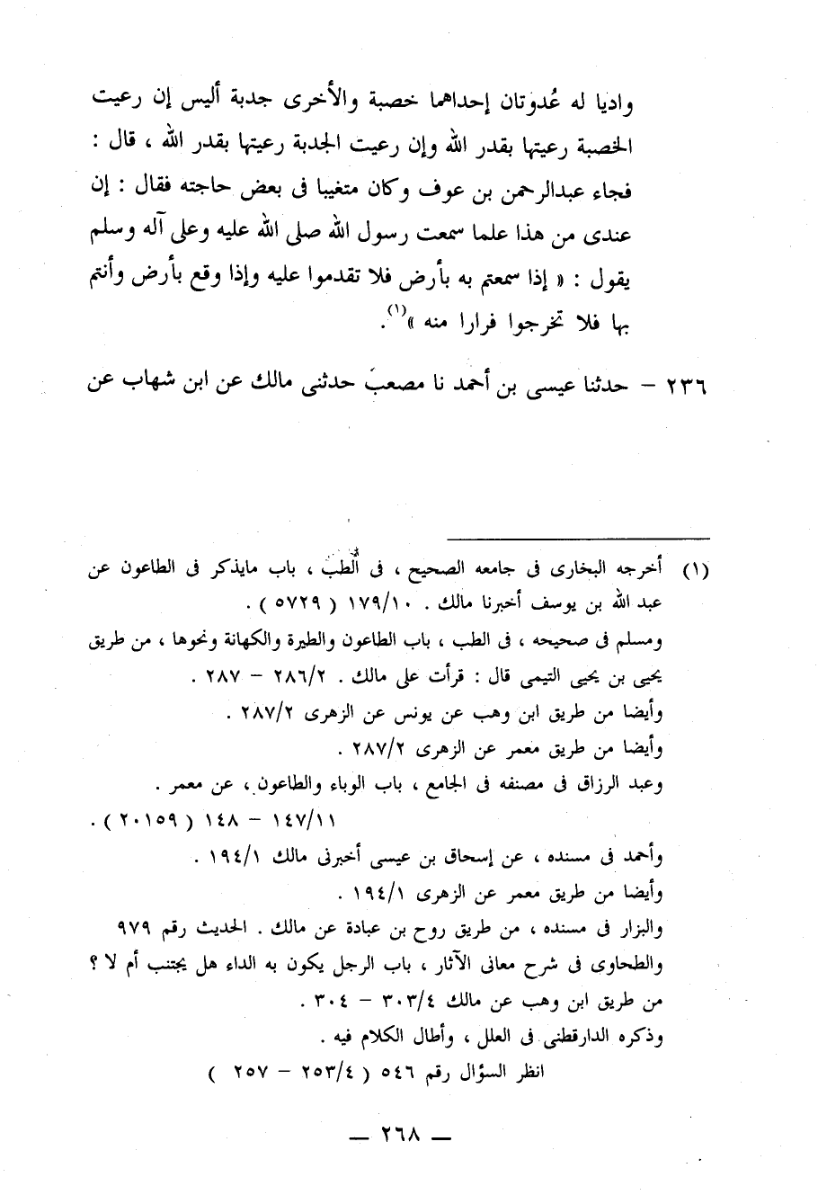 236 - حَدَّثَنَا عِيسَى بْنُ أَحْمَدَ، نا مُصْعَبٌ، حَدَّثَنِي مَالِكٌ، عَنِ ابْنِ شِهَابٍ، عَنْ عَبْدِ اللَّهِ بْنِ عَامِرِ بْنِ رَبِيعَةَ، أَنَّ عُمَرَ خَرَجَ إِلَى الشَّامِ فَلَمَّا جَاءَ سَرْغَ بَلَغَهُ أَنَّ الْوَبَاءَ وَقَعَ بِالشَّامِ، فَأَخْبَرَهُ عَبْدُ الرَّحْمَنِ بْنُ عَوْفٍ أَنَّ رَسُولَ اللَّهِ صَلَّى اللَّهُ عَلَيْهِ وَعَلَى آلِهِ وَسَلَّمَ قَالَ: «§إِذَا سَمِعْتُمْ بِهِ بِأَرْضٍ فَلَا تُقْدِمُوا عَلَيْهِ، وَإِذَا وَقَعَ بِأَرْضٍ وَأَنْتُمْ بِهَا فَلَا تَخْرُجُوا فِرَارًا مِنْهُ» . فَرَجَعَ مِنْ سَرْغَ