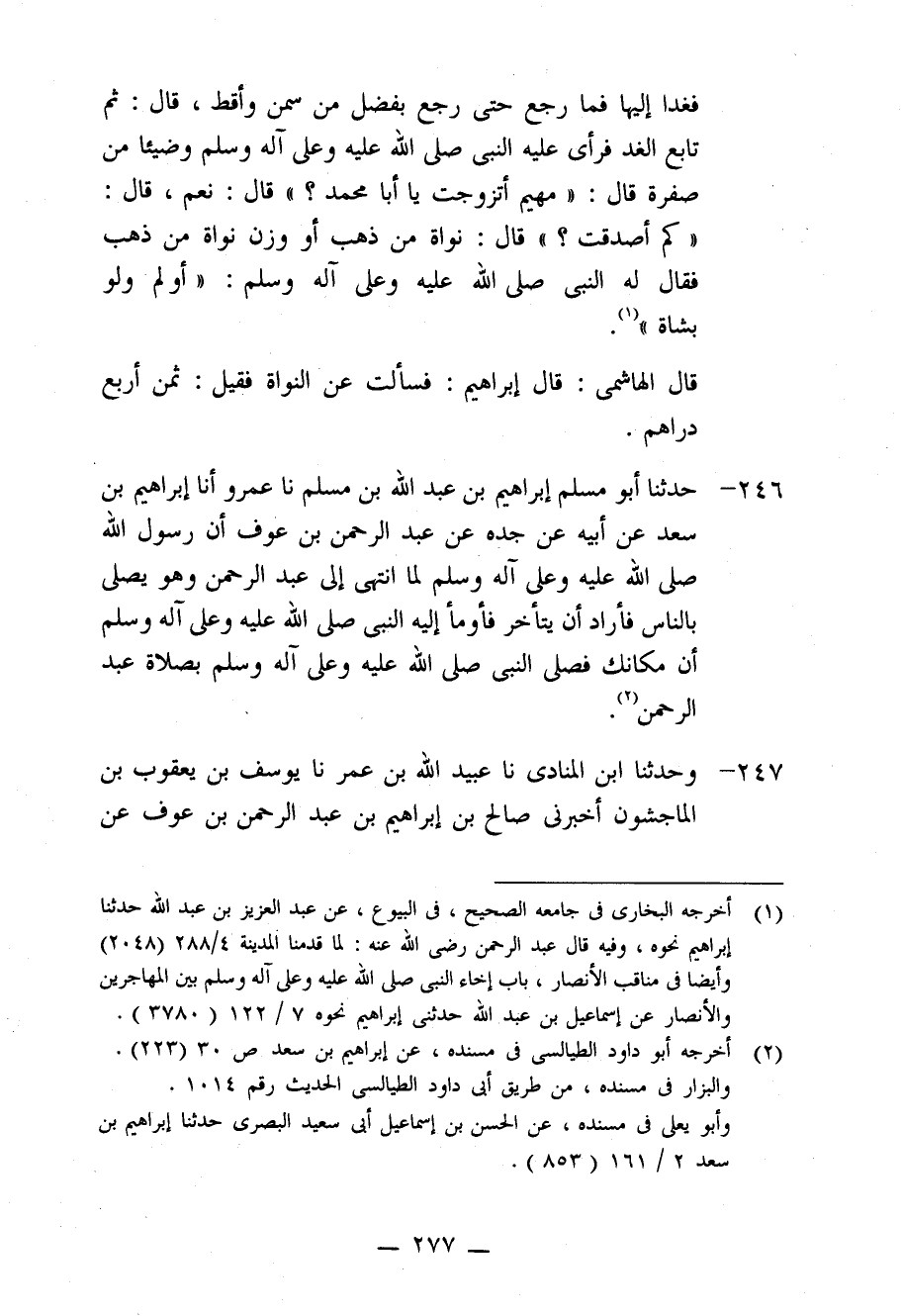 246 - حَدَّثَنَا أَبُو مُسْلِمٍ إِبْرَاهِيمُ بْنُ عَبْدِ اللَّهِ بْنِ مُسْلِمٍ، نا عَمْرٌو، أَنا إِبْرَاهِيمُ بْنُ سَعْدٍ، عَنْ أَبِيهِ، عَنْ جَدِّهِ، عَنْ عَبْدِ الرَّحْمَنِ بْنِ عَوْفٍ، «أَنَّ رَسُولَ اللَّهِ صَلَّى اللَّهُ عَلَيْهِ وَعَلَى آلِهِ وَسَلَّمَ §لَمَّا انْتَهَى إِلَى عَبْدِ الرَّحْمَنِ وَهُوَ يُصَلِّي بِالنَّاسِ فَأَرَادَ أَنْ يَتَأَخَّرَ، فَأَوْمَأَ إِلَيْهِ النَّبِيُّ صَلَّى اللَّهُ عَلَيْهِ وَعَلَى آلِهِ وَسَلَّمَ أَنْ مَكَانَكَ فَصَلَّى النَّبِيُّ صَلَّى اللَّهُ عَلَيْهِ وَعَلَى آلِهِ وَسَلَّمَ بِصَلَاةِ عَبْدِ الرَّحْمَنِ»