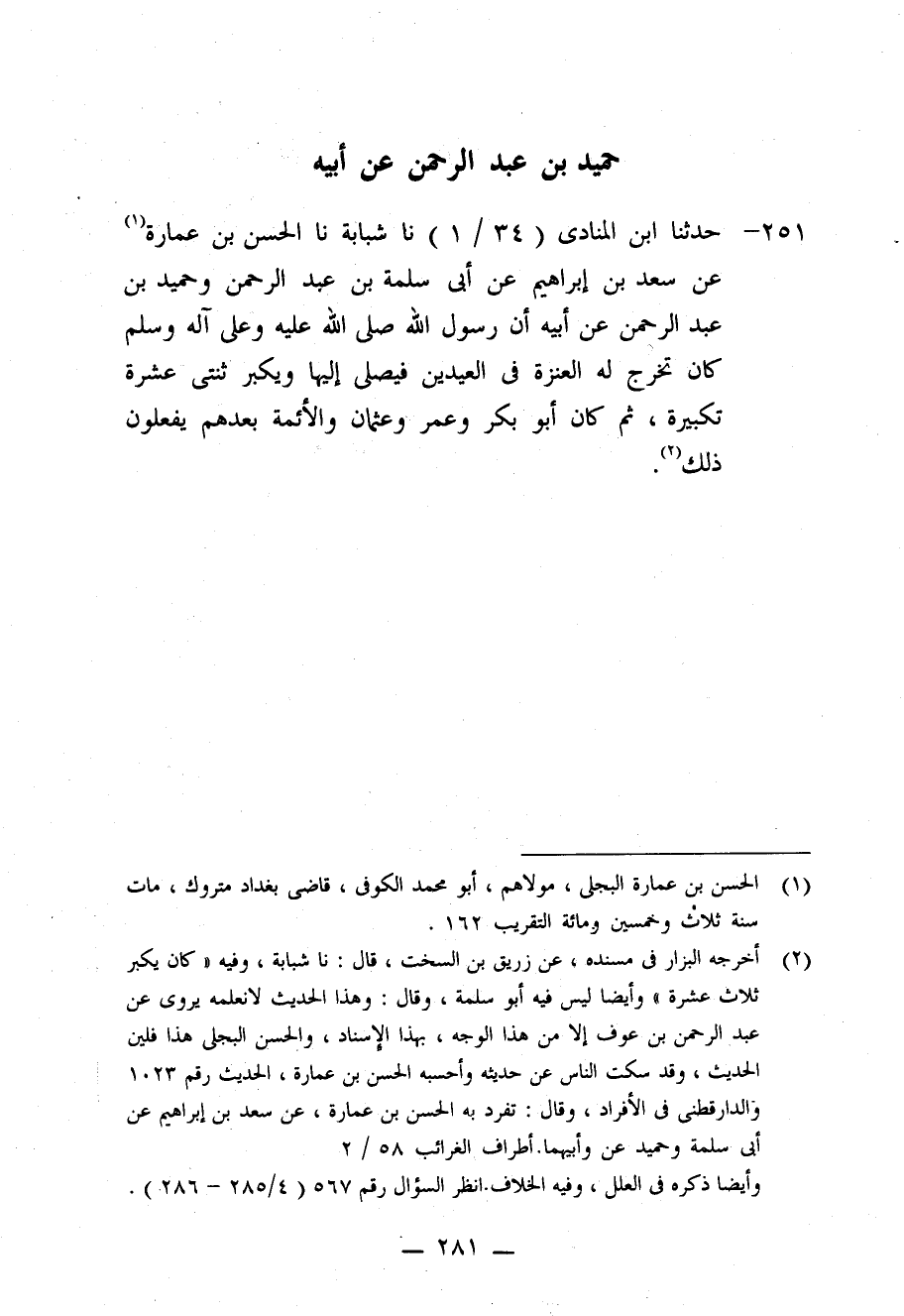 251 - حَدَّثَنَا ابْنُ الْمُنَادِي، نا شَبَابَةُ، نا الْحَسَنُ بْنُ عُمَارَةَ، عَنْ سَعْدِ بْنِ إِبْرَاهِيمَ، عَنْ أَبِي سَلَمَةَ بْنِ عَبْدِ الرَّحْمَنِ، وَحُمَيْدِ بْنِ عَبْدِ الرَّحْمَنِ، عَنْ أَبِيهِ، أَنَّ رَسُولَ اللَّهِ صَلَّى اللَّهُ عَلَيْهِ وَعَلَى آلِهِ وَسَلَّمَ كَانَ §تَخْرُجُ لَهُ الْعَنَزَةُ فِي الْعِيدَيْنِ فَيُصَلِّي إِلَيْهَا وَيُكَبِّرُ ثِنتَيْ عَشْرَةَ تَكْبِيرَةً، ثُمَّ كَانَ أَبُو بَكْرٍ , وَعُمَرُ , وَعُثْمَانُ وَالْأَئِمَّةُ بَعْدَهُمْ يَفْعَلُونَ ذَلِكَ