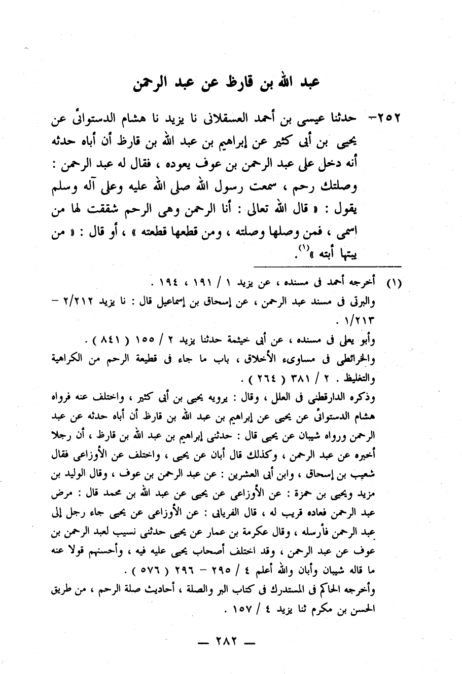 252 - حَدَّثَنَا عِيسَى بْنُ أَحْمَدَ الْعَسْقَلَانِيُّ، نا يَزِيدُ، نا هِشَامٌ الدَّسْتُوَائِيٌّ، عَنْ يَحْيَى بْنِ أَبِي كَثِيرٍ، عَنْ إِبْرَاهِيمَ بْنِ عَبْدِ اللَّهِ بْنِ قَارِظٍ، أَنَّ أَبَاهُ حَدَّثَهُ أَنَّهُ دَخَلَ عَلَى عَبْدِ الرَّحْمَنِ بْنِ عَوْفٍ يَعُودُهُ فَقَالَ لَهُ عَبْدُ الرَّحْمَنِ: وَصَلَتْكَ رَحِمٌ، سَمِعْتُ رَسُولَ اللَّهِ صَلَّى اللَّهُ عَلَيْهِ وَعَلَى آلِهِ وَسَلَّمَ يَقُولُ: قَالَ اللَّهُ تَعَالَى: «§أَنَا الرَّحْمَنُ وَهِيَ الرَّحِمُ شَقَقْتُ لَهَا مِنَ اسْمِي فَمَنْ وَصَلَهَا وَصَلْتُهُ وَمَنْ قَطَعَهَا قَطَعْتُهُ» - أَوْ قَالَ: «مَنْ يَبُتُّهَا أَبُتَّهُ»