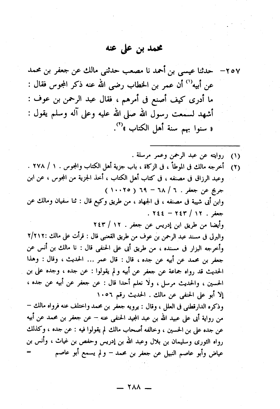 257 - حَدَّثَنَا عِيسَى بْنُ أَحْمَدَ، نا مُصْعَبٌ، حَدَّثَنِي مَالِكٌ، عَنْ جَعْفَرِ بْنِ مُحَمَّدٍ، عَنْ أَبِيهِ، أَنَّ عُمَرَ بْنَ الْخَطَّابِ، رَضِيَ اللَّهُ عَنْهُ ذَكَرَ الْمَجُوسَ فَقَالَ: مَا أَدْرِي كَيْفَ أَصْنَعُ فِي أَمْرِهِمْ. فَقَالَ عَبْدُ الرَّحْمَنِ بْنُ عَوْفٍ: أَشْهَدُ لَسَمِعْتُ رَسُولَ اللَّهِ صَلَّى اللَّهُ عَلَيْهِ وَعَلَى آلِهِ وَسَلَّمَ يَقُولُ: «§سُنُّوا بِهِمْ سُنَّةَ أَهْلِ الْكِتَابِ»