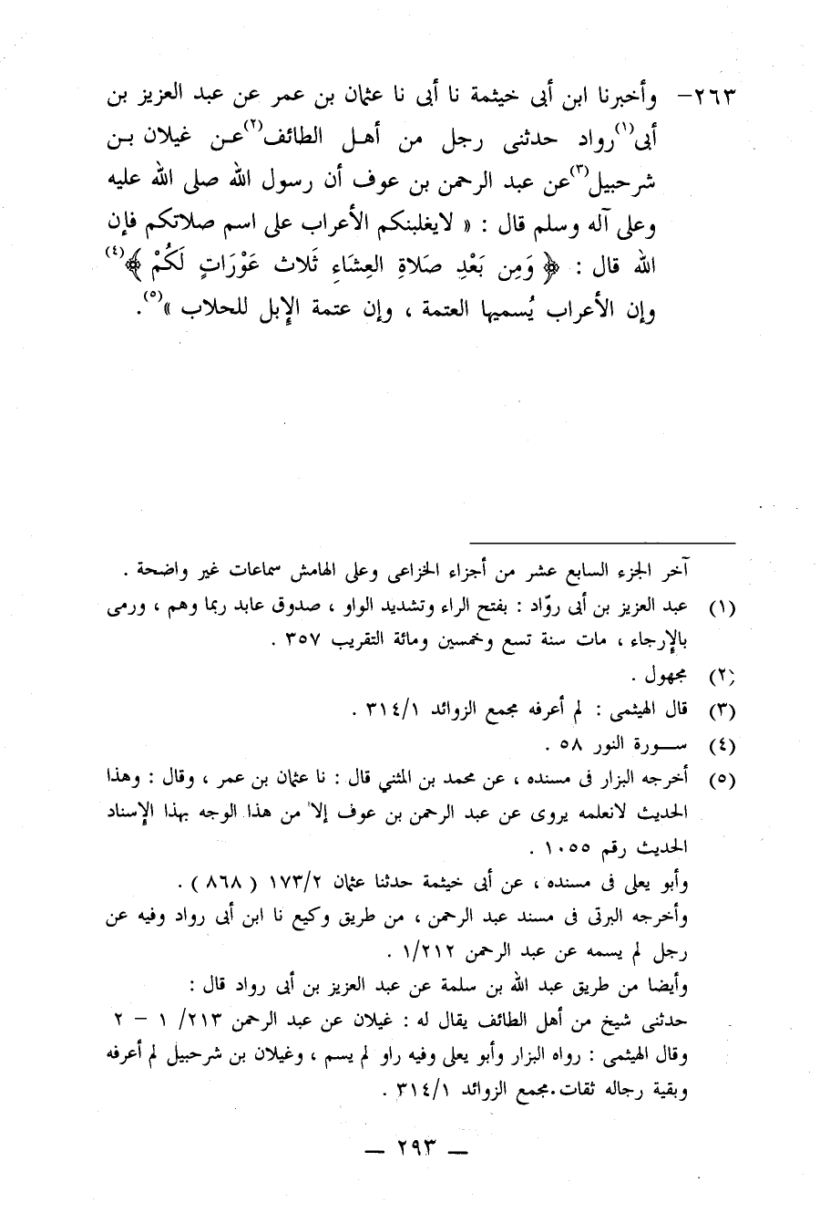 263 - وَأَخْبَرَنَا ابْنُ أَبِي خَيْثَمَةَ، نا أَبِي، نا عُثْمَانُ بْنُ عُمَرَ، عَنْ عَبْدِ الْعَزِيزِ بْنِ أَبِي رَوَّادٍ، حَدَّثَنِي رَجُلٌ مِنْ أَهْلِ الطَّائِفِ، عَنْ غَيْلَانَ بْنِ شُرَحْبِيلَ، عَنْ عَبْدِ الرَّحْمَنِ بْنِ عَوْفٍ، أَنَّ رَسُولَ اللَّهِ صَلَّى اللَّهُ عَلَيْهِ وَعَلَى آلِهِ وَسَلَّمَ قَالَ: " §لَا يَغْلِبَنَّكُمُ الْأَعْرَابُ عَلَى اسْمِ صَلَاتِكُمْ، فَإِنَّ اللَّهَ قَالَ: {وَمِنْ بَعْدِ صَلَاةِ الْعِشَاءِ ثَلَاثُ عَوْرَاتِ لَكُمْ} [النور: 58] ، وَإِنَّ الْأَعْرَابَ يُسَمِّيهَا الْعَتَمَةَ، وَإِنَّ عَتَمَةَ الْإِبِلِ لَلْحِلَابِ "