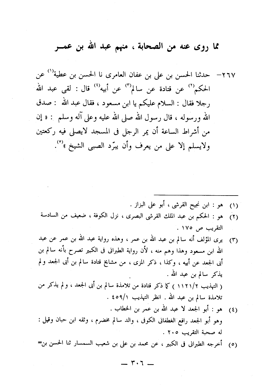 267 - حَدَّثَنَا الْحَسَنُ بْنُ عَلِيِّ بْنِ عَفَّانَ الْعَامِرِيِّ، نا الْحَسَنُ بْنُ عَطِيَّةَ، عَنِ الْحَكَمِ، عَنْ قَتَادَةَ، عَنْ سَالِمٍ، عَنْ أَبِيهِ قَالَ: لَقِيَ عَبْدُ اللَّهِ رَجُلًا فَقَالَ: السَّلَامُ عَلَيْكُمْ يَا ابْنَ مَسْعُودٍ، فَقَالَ عَبْدُ اللَّهِ: صَدَقَ اللَّهُ وَرَسُولُهُ قَالَ رَسُولُ اللَّهِ صَلَّى اللَّهُ عَلَيْهِ وَعَلَى آلِهِ وَسَلَّمَ: «إِنَّ §مِنْ أَشْرَاطِ السَّاعَةِ أَنْ يَمُرَّ الرَّجُلُ فِي الْمَسْجِدِ لَا يُصَلِّي فِيهِ رَكْعَتَيْنِ، وَلَا يُسَلِّمُ إِلَّا عَلَى مَنْ يَعْرِفُ، وَأَنْ يُبَرَّدَ الصَّبِيُّ الشَّيْخَ»