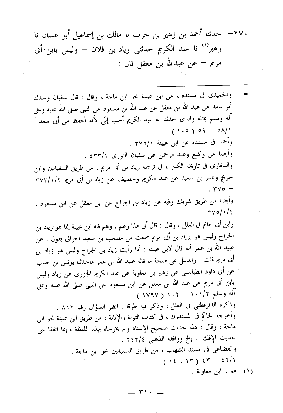 270 - حَدَّثَنَا أَحْمَدُ بْنُ زُهَيْرِ بْنِ حَرْبٍ، نا مَالِكُ بْنُ إِسْمَاعِيلَ أَبُو غَسَّانَ، نا زُهَيْرٌ، نا عَبْدُ الْكَرِيمِ، حَدَّثَنِي زِيَادُ بْنُ فُلَانٍ، وَلَيْسَ بِابْنِ أَبِي مَرْيَمَ، عَنْ عَبْدِ اللَّهِ بْنِ مَعْقِلٍ قَالَ: سَأَلَ أَبِي عَبْدَ اللَّهِ بْنَ مَسْعُودٍ وَأَنَا إِلَى جَنْبِهِ فَقَالَ: أَنْتَ سَمِعْتَ مِنْ رَسُولِ اللَّهِ صَلَّى اللَّهُ عَلَيْهِ وَعَلَى آلِهِ وَسَلَّمَ يَقُولُ: «§النَّدَمُ تَوْبَةٌ؟» قَالَ: نَعَمْ