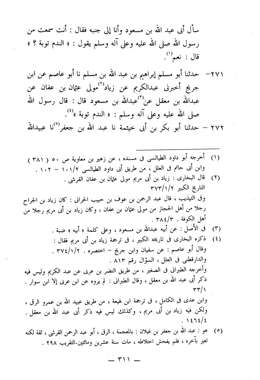 271 - حَدَّثَنَا أَبُو مُسْلِمٍ إِبْرَاهِيمُ بْنُ عَبْدِ اللَّهِ بْنِ مُسْلِمٍ، نا أَبُو عَاصِمٍ، عَنِ ابْنِ جُرَيْجٍ، أَخْبَرَنِي عَبْدُ الْكَرِيمِ، عَنْ زِيَادٍ مَوْلَى عُثْمَانَ بْنِ عَفَّانَ، عَنْ عَبْدِ اللَّهِ بْنِ مَعْقِلٍ، عَنْ عَبْدِ اللَّهِ بْنِ مَسْعُودٍ قَالَ: قَالَ رَسُولُ اللَّهِ صَلَّى اللَّهُ عَلَيْهِ وَعَلَى آلِهِ وَسَلَّمَ: «§النَّدَمُ تَوْبَةٌ»