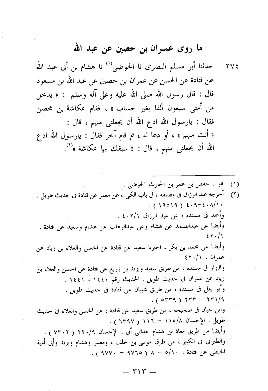 274 - حَدَّثَنَا أَبُو مُسْلِمٍ الْبَصْرِيُّ، نا الْحَوْضِيُّ، نا هِشَامُ بْنُ أَبِي عَبْدِ اللَّهِ، عَنْ قَتَادَةَ، عَنِ الْحَسَنِ، عَنْ عِمْرَانَ بْنِ حُصَيْنٍ، عَنْ عَبْدِ اللَّهِ بْنِ مَسْعُودٍ قَالَ: قَالَ رَسُولُ اللَّهِ صَلَّى اللَّهُ عَلَيْهِ وَعَلَى آلِهِ وَسَلَّمَ: «§يَدْخُلُ الْجَنَّةَ مِنْ أُمَّتِي سَبْعُونَ أَلْفًا بِغَيْرِ حِسَابٍ» 0 فَقَامَ عُكَّاشَةُ بْنُ مِحْصَنٍ فَقَالَ: يَا رَسُولَ اللَّهِ، ادْعُ اللَّهَ أَنْ يَجْعَلَنِي مِنْهُمْ قَالَ: «أَنْتَ مِنْهُمْ» ، أَوْ دَعَا لَهُ، ثُمَّ قَامَ آخَرُ فَقَالَ: يَا رَسُولَ اللَّهِ، ادْعُ اللَّهَ أَنْ يَجْعَلَنِي مِنْهُمْ قَالَ: «سَبَقَكَ بِهَا عُكَّاشَةُ»