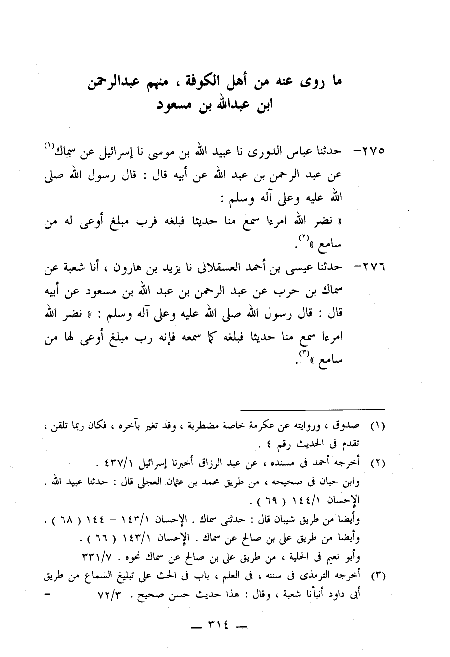 276 - حَدَّثَنَا عِيسَى بْنُ أَحْمَدَ الْعَسْقَلَانِيُّ، نا يَزِيدُ بْنُ هَارُونَ، أنا شُعْبَةُ، عَنْ سِمَاكِ بْنِ حَرْبٍ، عَنْ عَبْدِ الرَّحْمَنِ بْنِ عَبْدِ اللَّهِ بْنِ مَسْعُودٍ، عَنْ أَبِيهِ قَالَ: قَالَ رَسُولُ اللَّهِ صَلَّى اللَّهُ عَلَيْهِ وَعَلَى آلِهِ وَسَلَّمَ: «§نَضَّرَ اللَّهُ امْرَءًا سَمِعَ مِنَّا حَدِيثًا فَبَلَّغَهُ كَمَا سَمِعَهُ، فَإِنَّهُ رُبَّ مُبَلَّغٍ أَوْعَى لَهَا مِنْ سَامِعٍ»