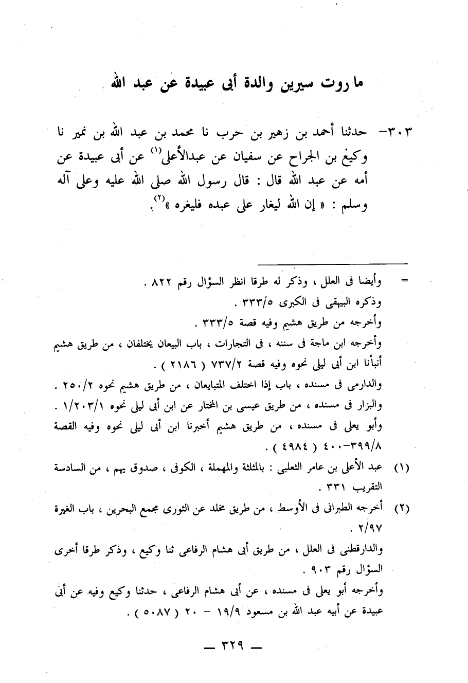 303 - حَدَّثَنَا أَحْمَدُ بْنُ زُهَيْرِ بْنِ حَرْبٍ، نا مُحَمَّدُ بْنُ عَبْدِ اللَّهِ بْنِ نُمَيْرٍ، نا وَكِيعُ بْنُ الْجَرَّاحِ، عَنْ سُفْيَانَ، عَنْ عَبْدِ الْأَعْلَى، عَنْ أَبِي عُبَيْدَةَ، عَنْ أُمَّهِ، عَنْ عَبْدِ اللَّهِ قَالَ: قَالَ رَسُولُ اللَّهِ صَلَّى اللَّهُ عَلَيْهِ وَعَلَى آلِهِ وَسَلَّمَ: «§إِنَّ اللَّهَ لَيَغَارُ عَلَى عَبْدِهِ فَلْيُغِرْهُ»