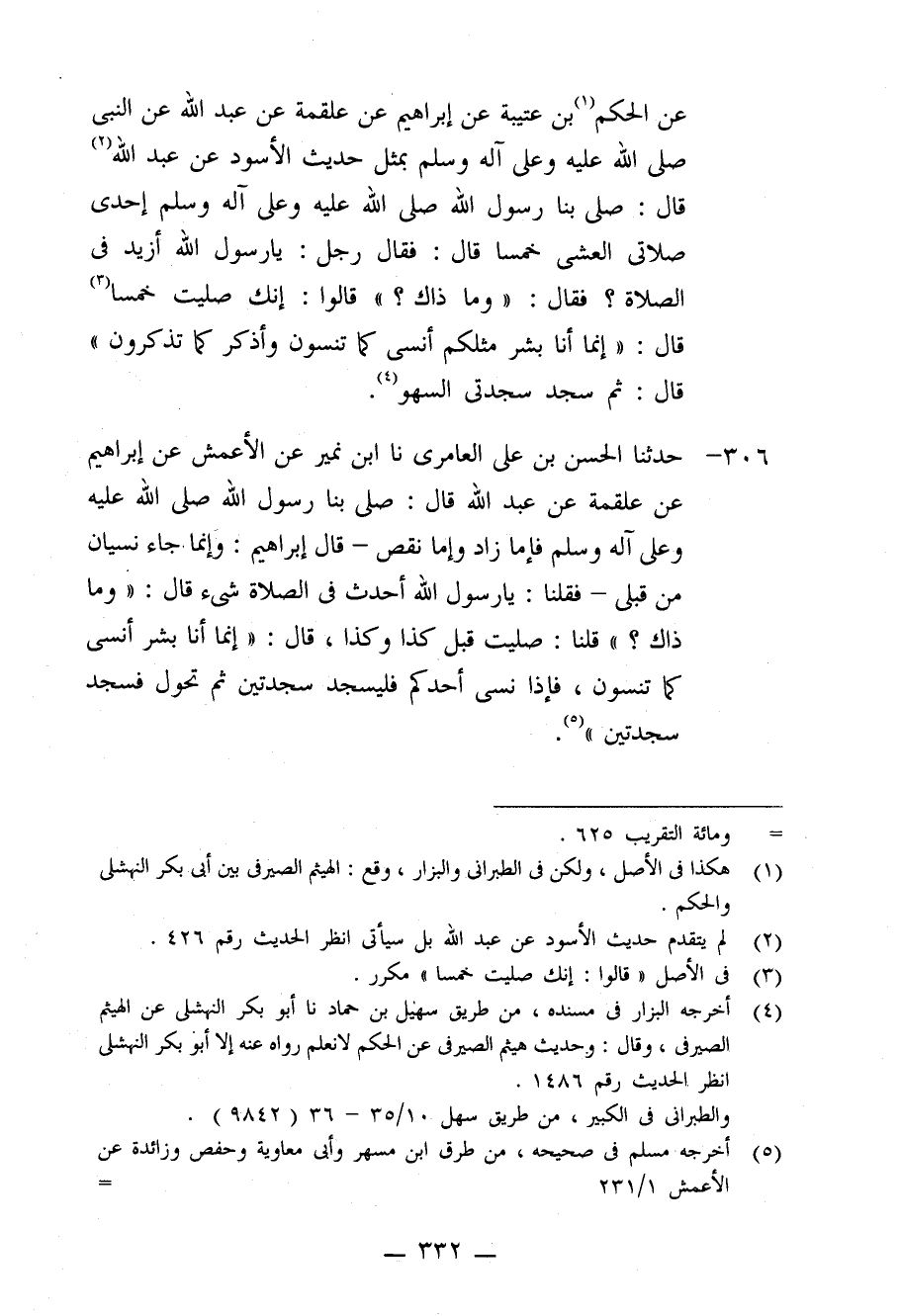 306 - حَدَّثَنَا الْحَسَنُ بْنُ عَلِيٍّ الْعَامِرِيُّ، نا ابْنُ نُمَيْرٍ، عَنِ الْأَعْمَشِ، عَنْ إِبْرَاهِيمَ، عَنْ عَلْقَمَةَ، عَنْ عَبْدِ اللَّهِ قَالَ: صَلَّى بِنَا رَسُولُ اللَّهِ صَلَّى اللَّهُ عَلَيْهِ وَعَلَى آلِهِ وَسَلَّمَ، فَإِمَّا زَادَ وَإِمَّا نَقَصَ - قَالَ إِبْرَاهِيمُ: وَإِنَّمَا جَاءَ نِسْيَانٌ مِنْ قِبَلِي - فَقُلْنَا: يَا رَسُولَ اللَّهِ، أَحَدَثَ فِي الصَّلَاةِ شَيْءٌ؟ قَالَ: «وَمَا ذَاكَ؟» قُلْنَا: صَلَّيْتَ قَبْلَ كَذَا وَكَذَا 0 قَالَ: «§إِنَّمَا أَنَا بَشَرٌ أَنْسَى كَمَا تَنْسَوْنَ، فَإِذَا نَسِيَ أَحَدُكُمْ فَلْيَسْجُدْ سَجْدَتَيْنِ» 0 ثُمَّ تَحَوَّلَ فَسَجَدَ سَجْدَتَيْنِ