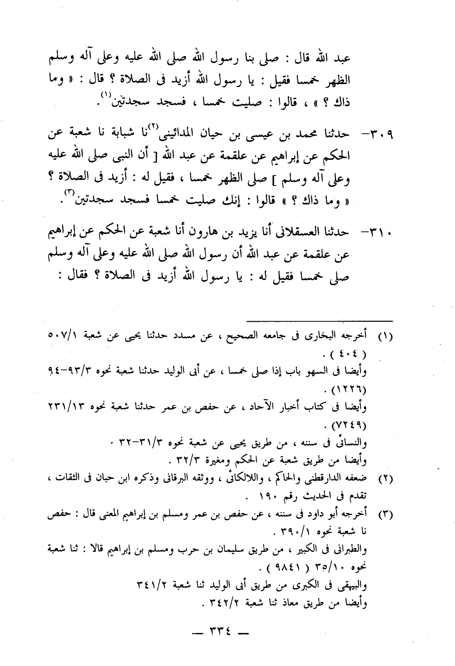 309 - حَدَّثَنَا مُحَمَّدُ بْنُ عِيسَى بْنِ حَيَّانَ الْمَدَائِنِيُّ، نا شَبَابَةُ، نا شُعْبَةُ، عَنِ الْحَكَمِ، عَنْ إِبْرَاهِيمَ، عَنْ عَلْقَمَةَ، عَنْ عَبْدِ اللَّهِ، أَنَّ النَّبِيَّ صَلَّى اللَّهُ عَلَيْهِ وَعَلَى آلِهِ وَسَلَّمَ §صَلَّى الظُّهْرَ خَمْسًا فَقِيلَ لَهُ: أَزِيدَ فِي الصَّلَاةِ؟ قَالَ: «وَمَا ذَاكَ؟» قَالُوا: إِنَّكَ صَلَّيْتَ خَمْسًا، فَسَجَدَ سَجْدَتَيْنِ