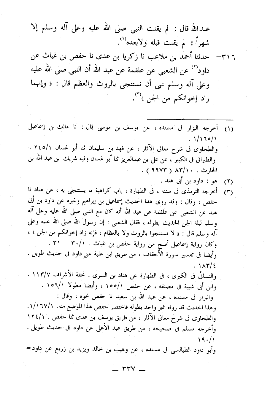 316 - حَدَّثَنَا أَحْمَدُ بْنُ مُلَاعِبٍ، نا زَكَرِيَّا بْنُ عَدِيٍّ، نا حَفْصُ بْنُ غِيَاثٍ، عَنْ دَاوُدَ، عَنِ الشَّعْبِيِّ، عَنْ عَلْقَمَةَ، عَنْ عَبْدِ اللَّهِ، أَنَّ النَّبِيَّ صَلَّى اللَّهُ عَلَيْهِ وَعَلَى آلِهِ وَسَلَّمَ §نَهَى أَنْ نَسْتَنْجِيَ بِالرَّوَثِ وَالْعَظْمِ قَالَ: «وَإِنَّهُمَا زَادُ إِخْوَانِكُمْ مِنَ الْجِنِّ»