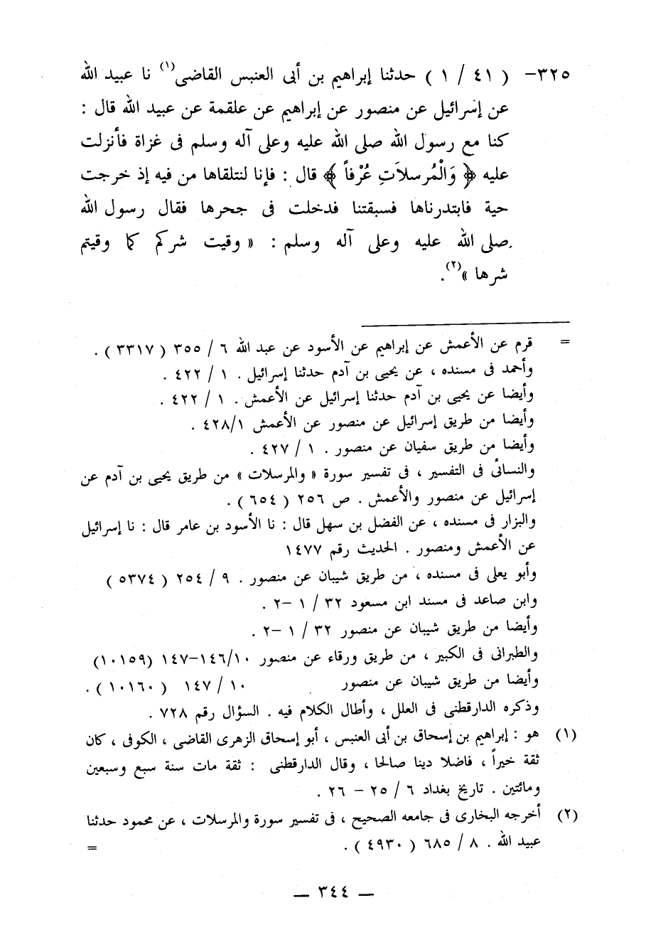 325 - حَدَّثَنَا إِبْرَاهِيمُ بْنُ أَبِي الْعَنْبَسِ الْقَاضِي، نا عُبَيْدُ اللَّهِ، عَنْ إِسْرَائِيلَ، عَنْ مَنْصُورٍ، عَنْ إِبْرَاهِيمَ، عَنْ عَلْقَمَةَ، عَنْ عَبْدِ اللَّهِ قَالَ: كُنَّا مَعَ رَسُولِ اللَّهِ صَلَّى اللَّهُ عَلَيْهِ وَعَلَى آلِهِ وَسَلَّمَ فِي غَزَاةٍ فَأُنْزِلَتْ عَلَيْهِ: وَالْمُرْسَلَاتِ عُرْفًا قَالَ: فَإِنَّا لَنَتَلَقَّاهَا مِنْ فِيهِ إِذْ خَرَجَتْ حَيَّةٌ فَابْتَدَرْنَاهَا فَسَبَقَتْنَا فَدَخَلَتْ فِي جُحْرِهَا، فَقَالَ رَسُولُ اللَّهِ صَلَّى اللَّهُ عَلَيْهِ وَعَلَى آلِهِ وَسَلَّمَ: «§وُقِيَتْ شَرَّكُمْ كَمَا وُقِيتُمْ شَرَّهَا»