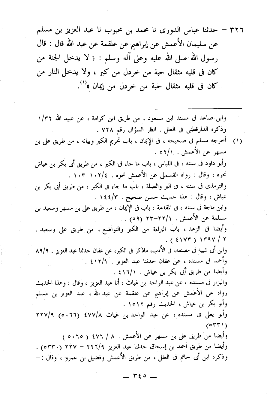326 - حَدَّثَنَا عَبَّاسٌ الدُّورِيُّ، نا مُحَمَّدُ بْنُ مَحْبُوبٍ، نا عَبْدُ الْعَزِيزِ بْنُ مُسْلِمٍ، عَنْ سُلَيْمَانَ الْأَعْمَشِ، عَنْ إِبْرَاهِيمَ، عَنْ عَلْقَمَةَ، عَنْ عَبْدِ اللَّهِ قَالَ: قَالَ رَسُولُ اللَّهِ صَلَّى اللَّهُ عَلَيْهِ وَعَلَى آلِهِ وَسَلَّمَ: «§لَا يَدْخُلُ الْجَنَّةَ مَنْ كَانَ فِي قَلْبِهِ مِثْقَالُ حَبَّةٍ مِنْ خَرْدَلٍ مِنْ كِبْرٍ، وَلَا يَدْخُلُ النَّارَ مَنْ كَانَ فِي قَلْبِهِ مِثْقَالُ حَبَّةٍ مِنْ خَرْدَلٍ مِنْ إِيمَانٍ»