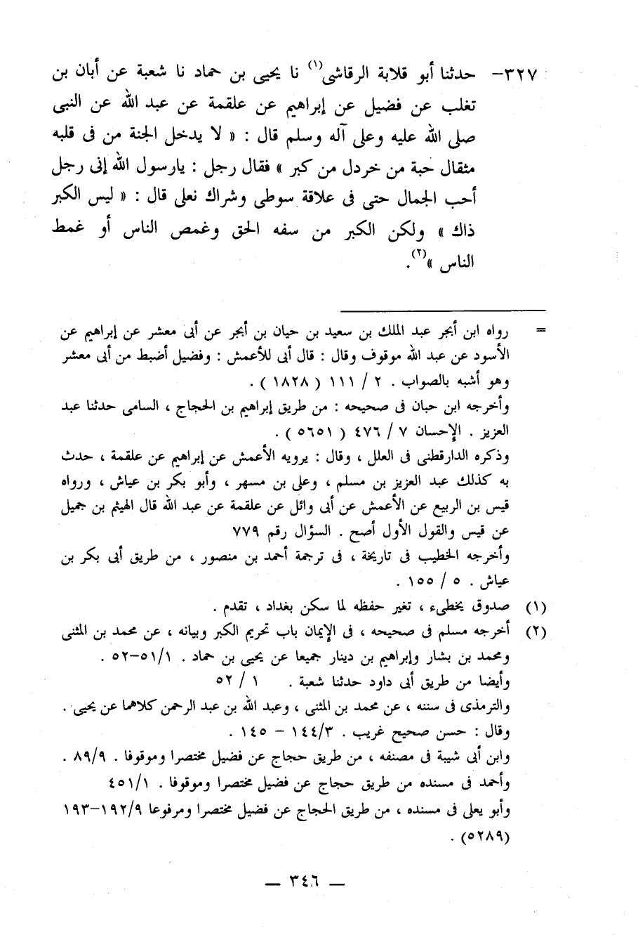327 - حَدَّثَنَا أَبُو قِلَابَةَ الرَّقَاشِيُّ، نا يَحْيَى بْنُ حَمَّادٍ، نا شُعْبَةُ، عَنْ أَبَانَ بْنِ تَغْلِبَ، عَنْ فُضَيْلٍ، عَنْ إِبْرَاهِيمَ، عَنْ عَلْقَمَةَ، عَنْ عَبْدِ اللَّهِ، عَنِ النَّبِيِّ صَلَّى اللَّهُ عَلَيْهِ وَعَلَى آلِهِ وَسَلَّمَ قَالَ: «§لَا يَدْخُلُ الْجَنَّةَ مَنْ فِي قَلْبِهِ مِثْقَالُ حَبَّةٍ مِنْ خَرْدَلٍ مِنْ كِبْرٍ» ، فَقَالَ رَجُلٌ: يَا رَسُولَ اللَّهِ، إِنِّي رَجُلٌ أُحِبُّ الْجَمَالَ حَتَّى فِي عَلَاقَةِ سَوْطِي وَشِرَاكِ نَعْلِي؟ قَالَ: «لَيْسَ الْكِبْرُ ذَاكَ، وَلَكِنَّ الْكِبْرَ مَنْ سَفِهَ الْحَقَّ وَغَمَصَ النَّاسَ أَوْ غَمَطَ النَّاسَ»