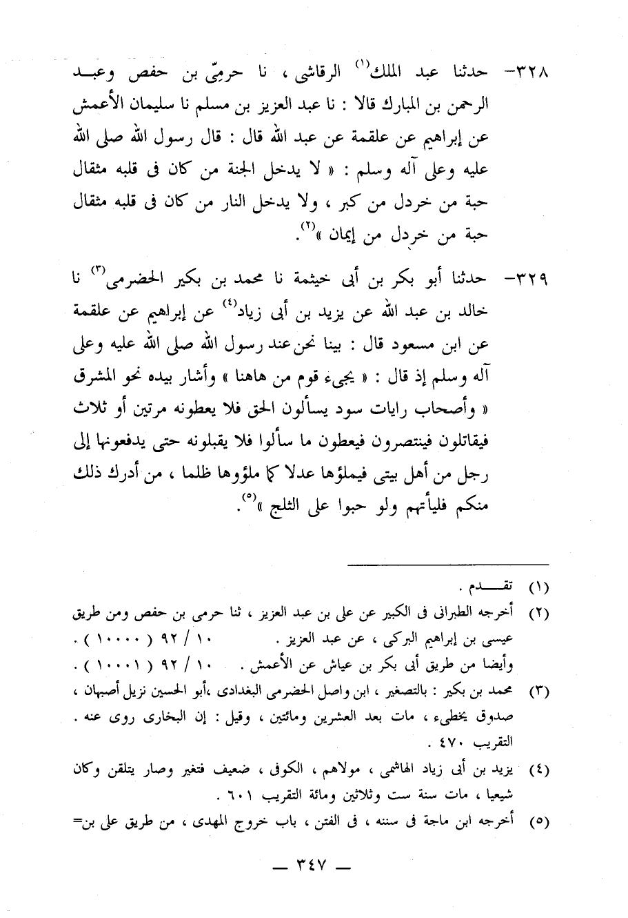 328 - حَدَّثَنَا عَبْدُ الْمَلِكِ الرَّقَاشيُّ، نا حَرَمِيُّ بْنُ حَفْصٍ، وَعَبْدُ الرَّحْمَنِ بْنُ الْمُبَارَكِ، قَالَا: نا عَبْدُ الْعَزِيزِ بْنُ مُسْلِمٍ، نا سُلَيْمَانُ الْأَعْمَشُ، عَنْ إِبْرَاهِيمَ، عَنْ عَلْقَمَةَ، عَنْ عَبْدِ اللَّهِ قَالَ: قَالَ رَسُولُ اللَّهِ صَلَّى اللَّهُ عَلَيْهِ وَعَلَى آلِهِ وَسَلَّمَ: «§لَا يَدْخُلُ الْجَنَّةَ مَنْ كَانَ فِي قَلْبِهِ مِثْقَالُ حَبَّةٍ مِنْ خَرْدَلٍ مِنْ كِبْرٍ، وَلَا يَدْخُلُ النَّارَ مَنْ كَانَ فِي قَلْبِهِ مِثْقَالُ حَبَّةٍ مِنْ خَرْدَلٍ مِنْ إِيمَانٍ»