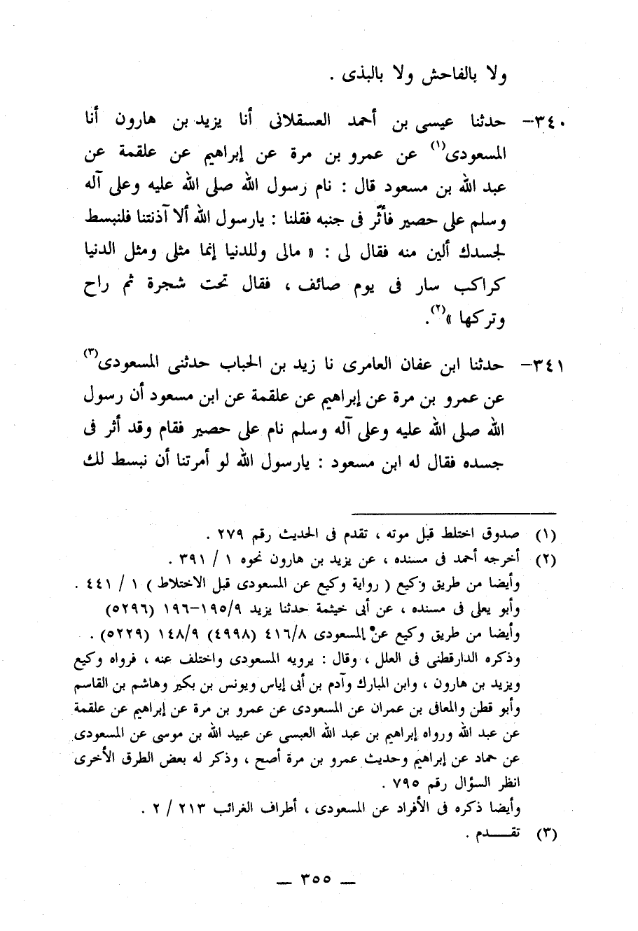 340 - حَدَّثَنَا عِيسَى بْنُ أَحْمَدَ الْعَسْقَلَانِيُّ، أنا يَزِيدُ بْنُ هَارُونَ، أنا الْمَسْعُودِيُّ، عَنْ عَمْرِو بْنِ مُرَّةَ، عَنْ إِبْرَاهِيمَ، عَنْ عَلْقَمَةَ، عَنْ عَبْدِ اللَّهِ بْنِ مَسْعُودٍ قَالَ: نَامَ رَسُولُ اللَّهِ صَلَّى اللَّهُ عَلَيْهِ وَعَلَى آلِهِ وَسَلَّمَ عَلَى حَصِيرٍ فَأَثَّرَ فِي جَنْبِهِ، فَقُلْنَا: يَا رَسُولَ اللَّهِ، أَلَا آذَنْتَنَا فَلْنَبْسُطَ لِجَسَدِكَ أَلْيَنَ مِنْهُ؟ فَقَالَ لِي: «§مَا لِي وَلِلدُّنْيَا، إِنَّمَا مَثَلي وَمَثَلُ الدُّنْيَا كَرَاكِبٍ سَارَ فِي يَوْمٍ صَائِفٍ فَقَالَ تَحْتَ شَجَرَةٍ ثُمَّ رَاحَ وَتَرَكَهَا»
