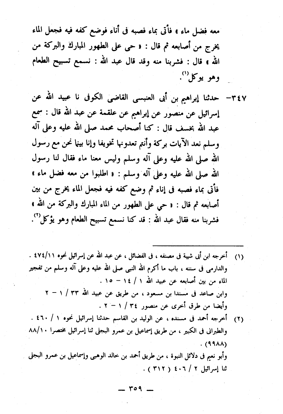 347 - حَدَّثَنَا إِبْرَاهِيمُ بْنُ أَبِي الْعَنْبَسِ الْقَاضِي الْكُوفِيُّ، نا عُبَيْدُ اللَّهِ، عَنْ إِسْرَائِيلَ، عنِ مَنْصُورٍ، عَنْ إِبْرَاهِيمَ، عَنْ عَلْقَمَةَ، عَنْ عَبْدِ اللَّهِ قَالَ: سَمِعَ عَبْدُ اللَّهِ بِخَسْفٍ فَقَالَ: كُنَّا أَصْحَابَ مُحَمَّدٍ صَلَّى اللَّهُ عَلَيْهِ وَعَلَى آلِهِ وَسَلَّمَ نَعُدُّ الْآيَاتِ بَرَكَةً، وَأَنْتُمْ تَعُدُّونَهَا تَخْوِيفًا، وَإِنَّا بَيْنَمَا نَحْنُ مَعَ رَسُولِ اللَّهِ صَلَّى اللَّهُ عَلَيْهِ وَعَلَى آلِهِ وَسَلَّمَ وَلَيْسَ مَعَنَا مَاءٌ، فَقَالَ لَنَا رَسُولُ اللَّهِ صَلَّى اللَّهُ عَلَيْهِ وَعَلَى آلِهِ وَسَلَّمَ: «اطْلُبُوا مَنْ مَعَهُ فَضْلُ مَاءٍ» ، فَأُتِيَ بِمَاءٍ فَصَبَّهُ فِي إِنَاءٍ ثُمَّ وَضَعَ كَفَّهُ فِيهِ، فَجَعَلَ الْمَاءُ يَخْرُجُ مِنْ بَيْنِ أَصَابِعِهِ، ثُمَّ قَالَ: «§حَيَّ عَلَى الطَّهُورِ مِنَ الْمَاءِ الْمُبَارَكِ، وَالْبَرَكَةُ مِنَ اللَّهِ» ، فَشَرِبْنَا مِنْهُ، فَقَالَ عَبْدُ اللَّهِ: قَدْ كُنَّا نَسْمَعُ تَسْبِيحَ الطَّعَامِ وَهُوَ يُؤْكَلُ