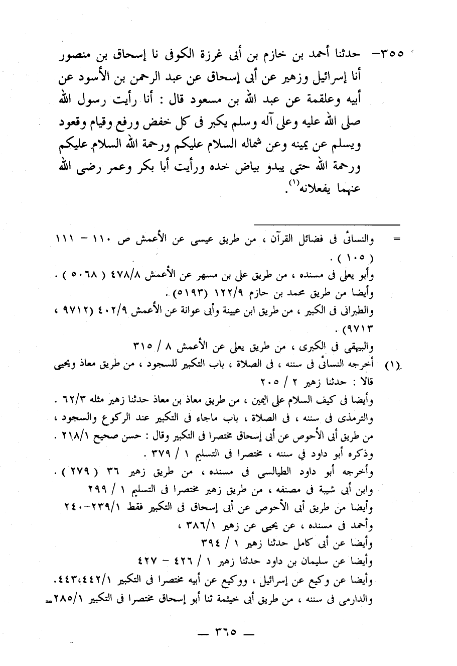 355 - حَدَّثَنَا أَحْمَدُ بْنُ خَازِمِ بْنِ أَبِي غَرَزَةَ الْكُوفِيُّ، نا إِسْحَاقُ بْنُ مَنْصُورٍ، أنا إِسْرَائِيلُ، وَزُهَيْرٌ، عَنْ أَبِي إِسْحَاقَ، عَنْ عَبْدِ الرَّحْمَنِ بْنِ الْأَسْوَدِ، عَنْ أَبِيهِ، وَعَلْقَمَةَ، عَنْ عَبْدِ اللَّهِ بْنِ مَسْعُودٍ قَالَ: أَنَا رَأَيْتُ رَسُولَ اللَّهِ صَلَّى اللَّهُ عَلَيْهِ وَعَلَى آلِهِ وَسَلَّمَ §يُكَبِّرُ فِي كُلِّ خَفْضٍ وَرَفْعٍ وَقِيَامٍ وَقُعُودٍ , وَيُسَلِّمُ عَنْ يَمِينِهِ وَعَنْ شِمَالِهِ السَّلَامُ عَلَيْكُمْ وَرَحْمَةُ اللَّهِ السَّلَامُ عَلَيْكُمْ وَرَحْمَةُ اللَّهِ حَتَّى يَبْدُوَ بَيَاضُ خَدِّهِ، وَرَأَيْتُ أَبَا بَكْرٍ , وَعُمَرَ رَضِيَ اللَّهُ عَنْهُمَا يَفْعَلَانِهِ