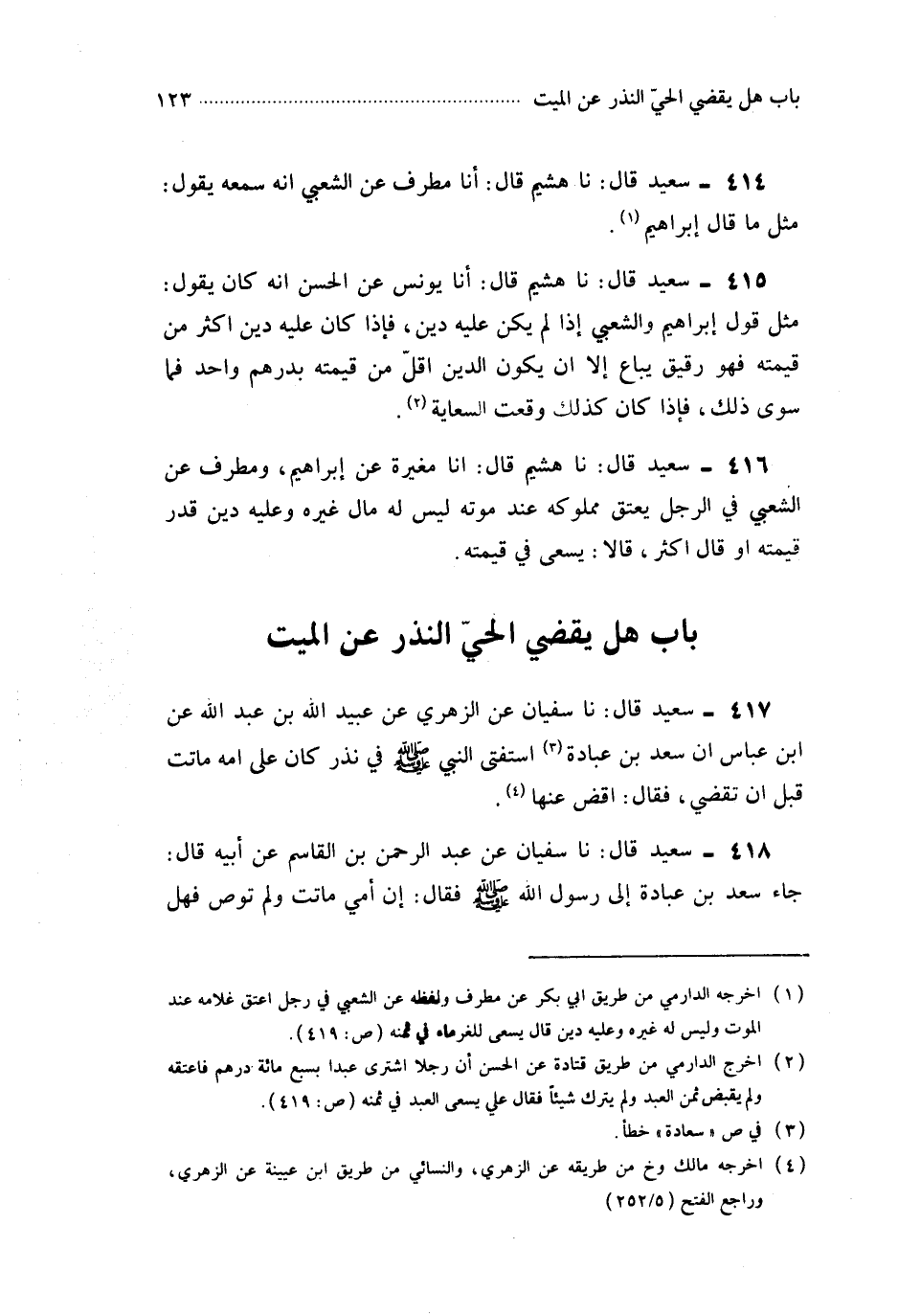 417- حَدَّثَنَا سُفْيَانُ ، عَنِ الزُّهْرِيِّ ، عَنْ عُبَيْدِ اللهِ بْنِ عَبْدِ اللهِ ، عَنِ ابْنِ عَبَّاسٍ أَنَّ سَعْدَ بْنَ عُبَادَةَ اسْتَفْتَى النَّبِيَّ صَلَّى اللَّهُ عَلَيْهِ وَسَلَّمَ فِي نَذْرٍ كَانَ عَلَى أُمِّهِ مَاتَتْ قَبْلَ أَنْ تَقْضِيَ ، فَقَالَ : اقْضِ عَنْهَا.