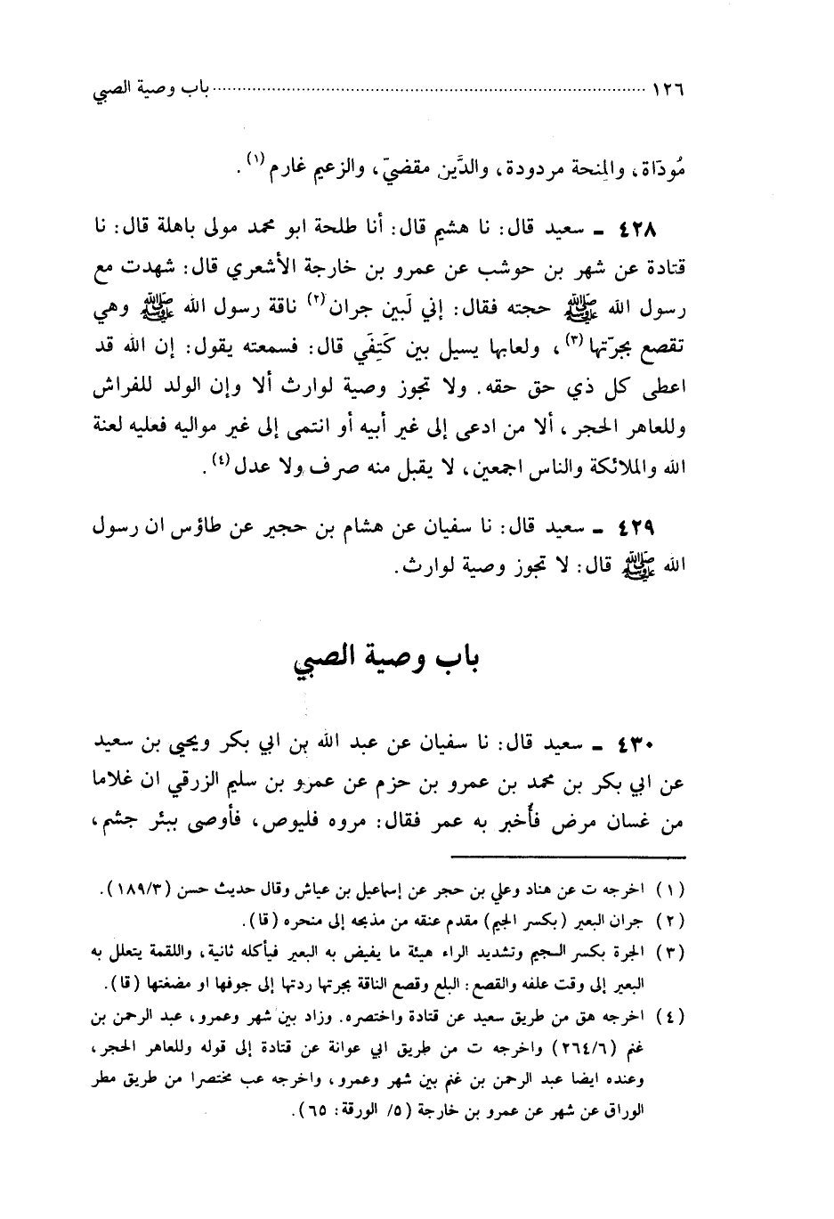 428- حَدَّثَنَا هُشَيْمٌ ، قَالَ : أَخْبَرَنَا طَلْحَةُ أَبُو مُحَمَّدٍ مَوْلَى بَاهِلَةَ قَالَ : حَدَّثَنَا قَتَادَةُ ، عَنْ شَهْرِ بْنِ حَوْشَبٍ ، عَنْ عَمْرِو بْنِ خَارِجَةَ الأَشْعَرِيِّ قَالَ : شَهِدْتُ مَعَ رَسُولِ اللهِ صَلَّى اللَّهُ عَلَيْهِ وَسَلَّمَ حَجَّتَهُ . فَقَالَ : إِنِّي لَبَيْنَ جِرَانِ نَاقَةِ رَسُولِ اللهِ صَلَّى اللَّهُ عَلَيْهِ وَسَلَّمَ وَهِيَ تَقْصَعُ بِجِرَّتِهَا ، وَلُعَابُهَا يَسِيلُ بَيْنَ كَتِفَيَّ . قَالَ : فَسَمِعْتُهُ يَقُولُ : إِنَّ اللَّهَ قَدْ أَعْطَى كُلَّ ذِي حَقٍّ حَقَّهُ ؛ وَلاَ تَجُوزُ وَصِيَّةٌ لِوَارِثٍ ، أَلاَ وَإِنَّ الْوَلَدَ لِلْفِرَاشِ وَلِلْعَاهِرِ الْحَجَرُ ، أَلاَ مَنِ ادَّعَى إِلَى غَيْرِ أَبِيهِ أَوِ انْتَمَى إِلَى غَيْرِ مَوَالِيهِ فَعَلَيْهِ لَعْنَةُ اللهِ وَالْمَلاَئِكَةِ وَالنَّاسِ أَجْمَعِينَ ، لاَ يُقْبَلُ مِنْهُ صَرْفٌ وَلاَ عَدْلٌ.