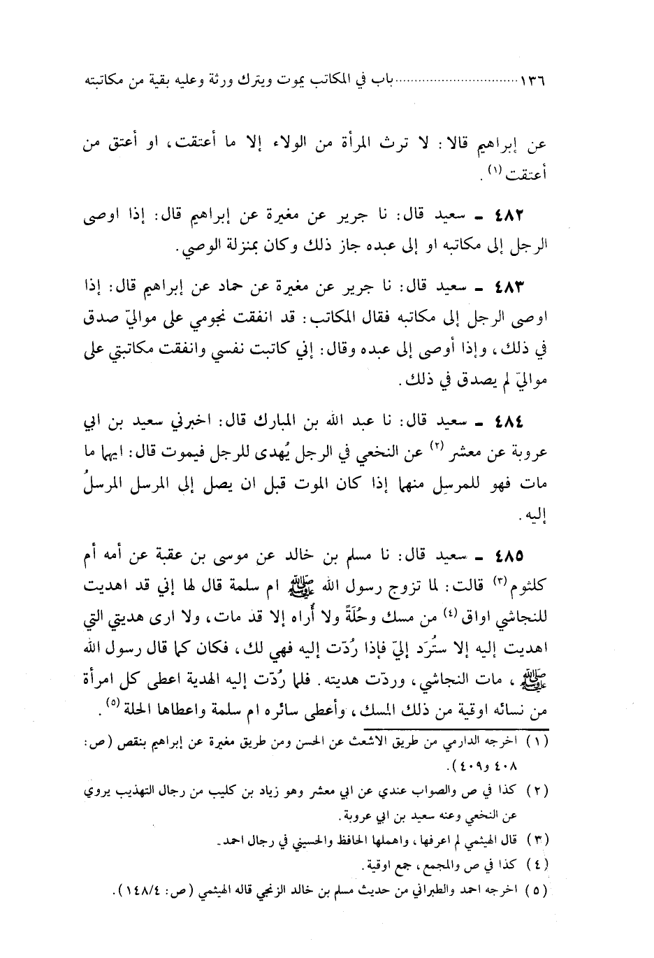 484- حَدَّثَنَا عَبْدُ اللهِ بْنُ الْمُبَارَكِ ، قَالَ : أَخْبَرَنِي سَعِيدُ بْنُ أَبِي عَرُوبَةَ ، عَنْ مَعْشَرٍ ، عَنْ النَّخَعِيِّ فِي الرَّجُلِ يُهْدَى لِلرَّجُلِ فَيَمُوتُ , قَالَ : أَيُّهُمَا مَا مَاتَ فَهُوَ لِلْمُرْسِلِ مِنْهُمَا ، إِذَا كَانَ الْمَوْتُ قَبْلَ أَنْ يَصِلَ إِلَى الْمُرْسَلِ الْمُرْسَلُ إِلَيْهِ.