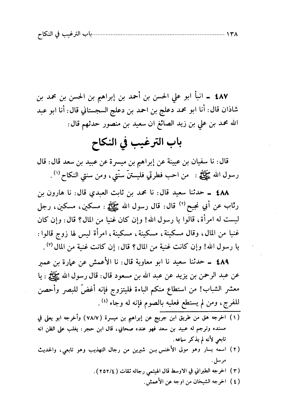 489- حَدَّثَنَا أَبُو مُعَاوِيَةَ ، قَالَ : حَدَّثَنَا الأَعْمَشُ ، عَنْ عُمَارَةَ بْنِ عُمَيْرٍ ، عَنْ عَبْدِ الرَّحْمَنِ بْنِ يَزِيدَ ، عَنْ عَبْدِ اللهِ بْنِ مَسْعُودٍ ، قَالَ : قَالَ رَسُولُ اللهِ صَلَّى اللَّهُ عَلَيْهِ وَسَلَّمَ : يَا مَعْشَرَ الشَّبَابِ ، مَنِ اسْتَطَاعَ مِنْكُمُ الْبَاءَةَ فَلْيَتَزَوَّجْ ؛ فَإِنَّهُ أَغَضُّ لِلْبَصَرِ وَأَحْصَنُ لِلْفَرْجِ ، وَمَنْ لَمْ يَسْتَطِعْ فَعَلَيْهِ بِالصَّوْمِ ؛ فَإِنَّهُ لَهُ وِجَاءٌ.
