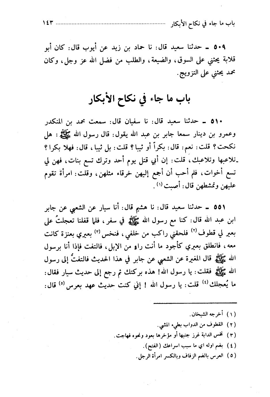 511- حَدَّثَنَا هُشَيْمٌ ، قَالَ : أَخْبَرَنَا سَيَّارٌ ، عَنِ الشَّعْبِيِّ ، عَنْ جَابِرِ بْنِ عَبْدِ اللهِ ، قَالَ : كُنَّا مَعَ رَسُولِ اللهِ صَلَّى اللَّهُ عَلَيْهِ وَسَلَّمَ فِي سَفَرٍ ، فَلَمَّا قَفَلْنَا تَعَجَّلْتُ عَلَى بَعِيرٍ لِي قَطُوفٍ فَلَحِقَنِي رَاكِبٌ مِنْ خَلْفِي فَنَخَسَ بَعِيرِي بِعَنَزَةٍ كَانَتْ مَعَهُ ، فَانْطَلَقَ بَعِيرِي كَأَجْوَدِ مَا أَنْتَ رَاءٍ مِنَ الإِبِلِ ، فَالْتَفَتُّ فَإِذَا أَنَا بِرَسُولِ اللهِ صَلَّى اللَّهُ عَلَيْهِ وَسَلَّمَ . قَالَ الْمُغِيرَةُ ، عَنِ الشَّعْبِيِّ ، عَنْ جَابِرٍ فِي هَذَا الْحَدِيثِ : فَالْتَفَتُّ إِلَى رَسُولِ اللهِ صَلَّى اللَّهُ عَلَيْهِ وَسَلَّمَ ، فَقُلْتُ : يَا رَسُولَ اللهِ ، هَذِهِ بَرَكَتُكَ . ثُمَّ رَجَعَ إِلَى حَدِيثِ سَيَّارٍ ، فَقَالَ : مَا يُعْجِلُكَ ؟ قُلْتُ : يَا رَسُولَ اللهِ ، إِنِّي كُنْتُ حَدِيثَ عَهْدٍ بِعُرْسٍ . قَالَ : فَبِكْرٌ تَزَوَّجْتَ أَوْ ثَيِّبٌ ؟ قُلْتُ : بَلْ ثَيِّبٌ . قَالَ : فَهَلاَّ جَارِيَةً تُلاَعِبُهَا وَتُلاَعِبُكَ ؟ فَقَالَ : إِذَا قَدِمْتَ عَلَى أَهْلِكَ فَالْكَيْسَ الْكَيْسَ . فَلَمَّا قَدِمْنَا ذَهَبْنَا نَدْخُلُ نَهَارًا ، فَقَالَ : أَمْهِلُوا حَتَّى نَدْخُلَ لَيْلاً - أَيْ عِشَاءً - لِكَيْ تَمْتَشِطَ الشَّعِثَةُ ، وَتَسْتَحِدَّ الْمُغِيبَةُ.