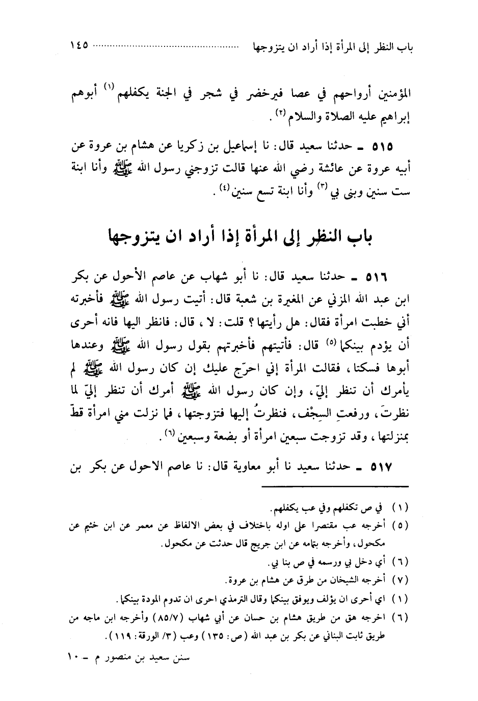 517- حَدَّثَنَا أَبُو مُعَاوِيَةَ ، قَالَ : حَدَّثَنَا عَاصِمٌ الأَحْوَلُ ، عَنْ بَكْرِ بْنِ عَبْدِ اللهِ الْمُزَنِيِّ ، عَنِ الْمُغِيرَةِ بْنِ شُعْبَةَ ، قَالَ : خَطَبْتُ امْرَأَةً ، فَقَالَ رَسُولُ اللهِ صَلَّى اللَّهُ عَلَيْهِ وَسَلَّمَ : نَظَرْتَ إِلَيْهَا ؟ فَقُلْتُ : لاَ . قَالَ : فَانْظُرْ إِلَيْهَا ؛ فَإِنَّهُ أَحْرَى أَنْ يُؤْدَمَ بَيْنَكُمَا .
