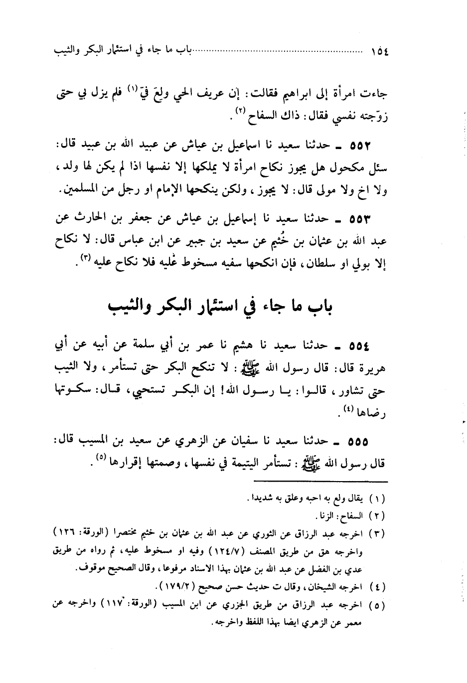 554- حَدَّثَنَا هُشَيْمٌ ، حَدَّثَنَا عُمَرُ بْنُ أَبِي سَلَمَةَ ، عَنْ أَبِيهِ ، عَنْ أَبِي هُرَيْرَةَ قَالَ : قَالَ رَسُولُ اللهِ صَلَّى اللَّهُ عَلَيْهِ وَسَلَّمَ : لاَ تُنْكَحُ الْبِكْرُ حَتَّى تُسْتَأْمَرَ ، وَلاَ الثَّيِّبُ حَتَّى تُشَاوَرَ . قَالُوا : يَا رَسُولَ اللهِ ، إِنَّ الْبِكْرَ تَسْتَحْيِي . قَالَ : سُكُوتُهَا رِضَاهَا.