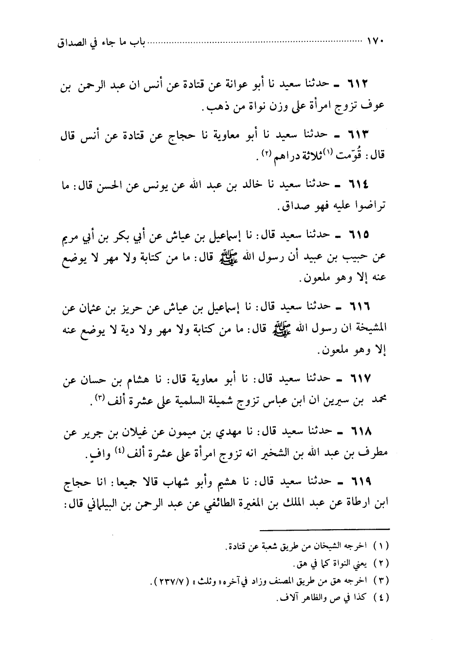 612- حَدَّثَنَا أَبُو عَوَانَةَ ، عَنْ قَتَادَةَ ، عَنْ أَنَسٍ أَنَّ عَبْدَ الرَّحْمَنِ بْنَ عَوْفٍ تَزَوَّجَ امْرَأَةً عَلَى وَزْنِ نَوَاةٍ مِنْ ذَهَبٍ.