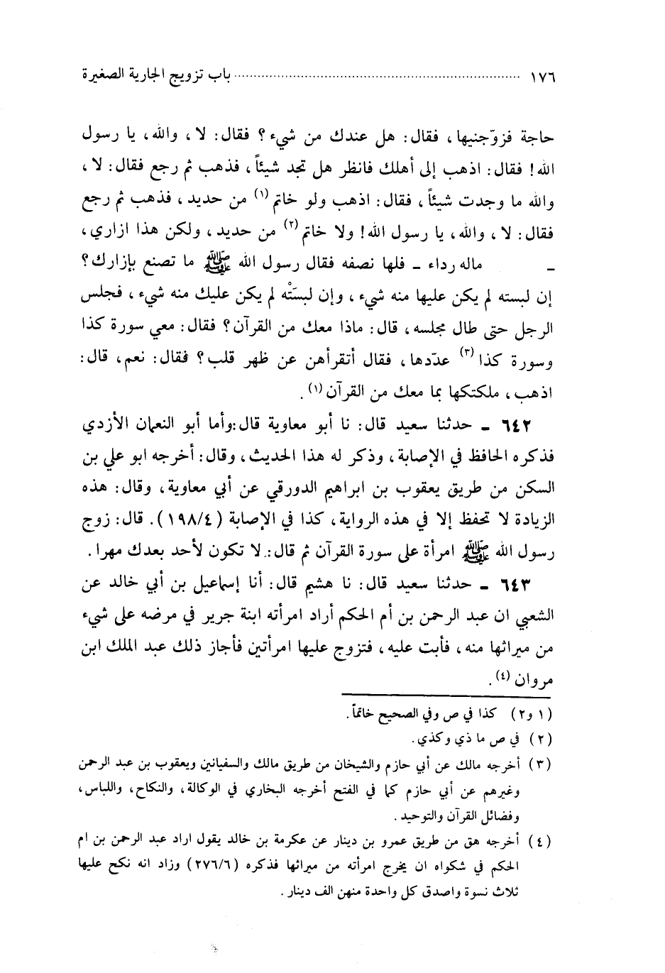 642- حَدَّثَنَا أَبُو مُعَاوِيَةَ ، قَالَ : حَدَّثَنَا أَبُو عَرْفَجَةَ الْفَايِشَيُّ ، عَنْ أَبِي النُّعْمَانِ الأَزْدِيِّ ، قَالَ : زَوَّجَ رَسُولُ اللهِ صلى الله عليه وسلم امْرَأَةً ، عَلَى سُورَةٍ مِنَ الْقُرْآنِ (1)، ثُمَّ قَالَ : لاَ تَكُونُ لأَحَدٍ بَعْدَكَ مَهْرًا.