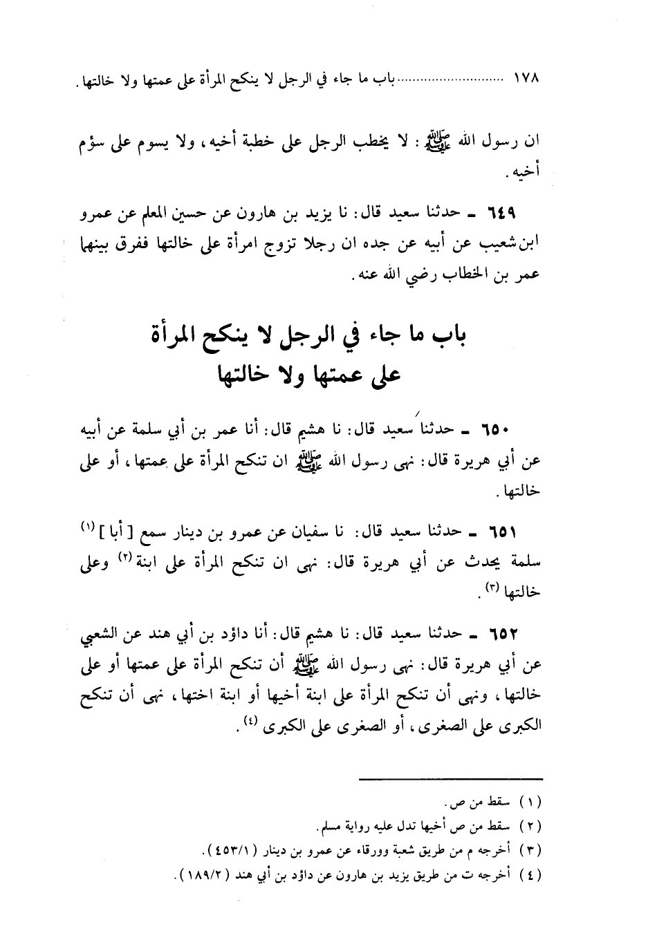 652- حَدَّثَنَا هُشَيْمٌ ، قَالَ : أَخْبَرَنَا دَاوُدُ بْنُ أَبِي هِنْدَ ، عَنِ الشَّعْبِيِّ ، عَنْ أَبِي هُرَيْرَةَ ، قَالَ : نَهَى رَسُولُ اللهِ صَلَّى اللَّهُ عَلَيْهِ وَسَلَّمَ أَنْ تُنْكَحَ الْمَرْأَةُ عَلَى عَمَّتِهَا أَوْ عَلَى خَالَتِهَا ، وَنَهَى أَنْ تُنْكَحَ الْمَرْأَةُ عَلَى ابْنَةِ أَخِيهَا أَوِ ابْنَةِ أُخْتِهَا ، نَهَى أَنْ تُنْكَحَ الْكُبْرَى عَلَى الصُّغْرَى ، أَوِ الصُّغْرَى عَلَى الْكُبْرَى.