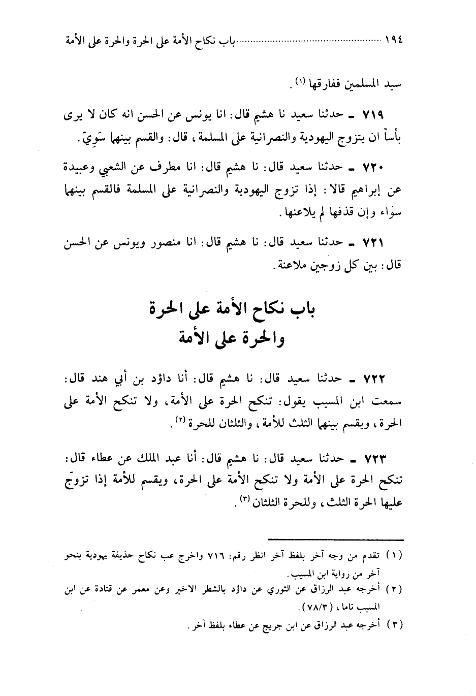 722- حَدَّثَنَا هُشَيْمٌ قَالَ : أَخْبَرَنَا دَاوُدُ بْنُ أَبِي هِنْدٍ ، قَالَ : سَمِعْتُ ابْنَ الْمُسَيَّبِ ، يَقُولُ : تُنْكَحُ الْحُرَّةُ عَلَى الأَمَةِ ، وَلاَ تُنْكَحُ الأَمَةُ عَلَى الْحُرَّةِ ، وَيُقْسَمُ بَيْنَهُمَا الثُّلُثُ لِلأَمَةِ ، وَالثُّلُثَانِ لِلْحُرَّةِ.
