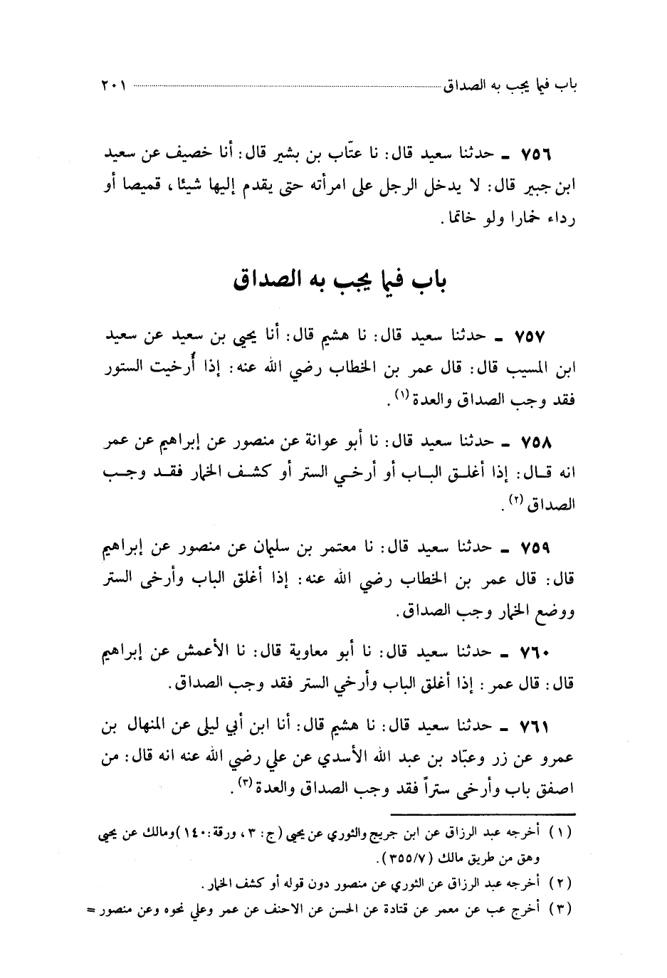 758- حَدَّثَنَا أَبُو عَوَانَةَ ، عَنْ مَنْصُورٍ ، عَنْ إِبْرَاهِيمَ ، عَنْ عُمَرَ ، أَنَّهُ قَالَ : إِذَا أُغْلِقَ الْبَابُ أَوْ أُرْخِيَ السِّتْرُ أَوْ كُشِفَ الْخِمَارُ فَقَدْ وَجَبَ الصَّدَاقُ.