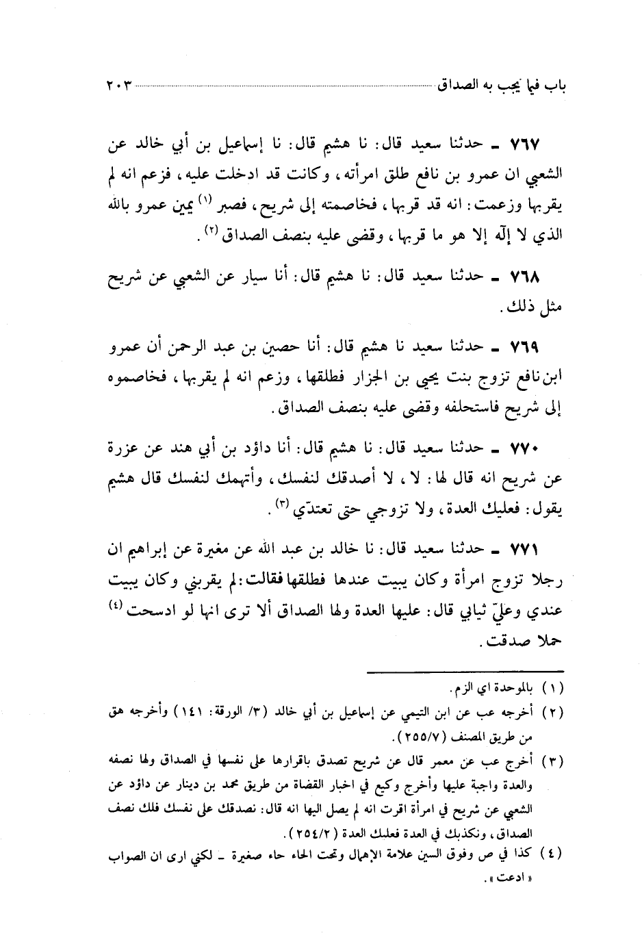 770- حَدَّثَنَا هُشَيْمٌ ، قَالَ : أَخْبَرَنَا دَاوُدُ بْنُ أَبِي هِنْدَ ، عَنْ عَزْرَةَ ، عَنْ شُرَيْحٍ ، أَنَّهُ قَالَ لَهَا : لاَ لاَ أُصَدِّقُكِ لِنَفْسِكِ ، وَأَتَّهِمُكِ لِنَفْسِكَ قَالَ هُشَيْمٌ يَقُولُ : فَعَلَيْكِ الْعِدَّةُ ، وَلاَ تَزَوَّجِي حَتَّى تَعْتَدِّي.