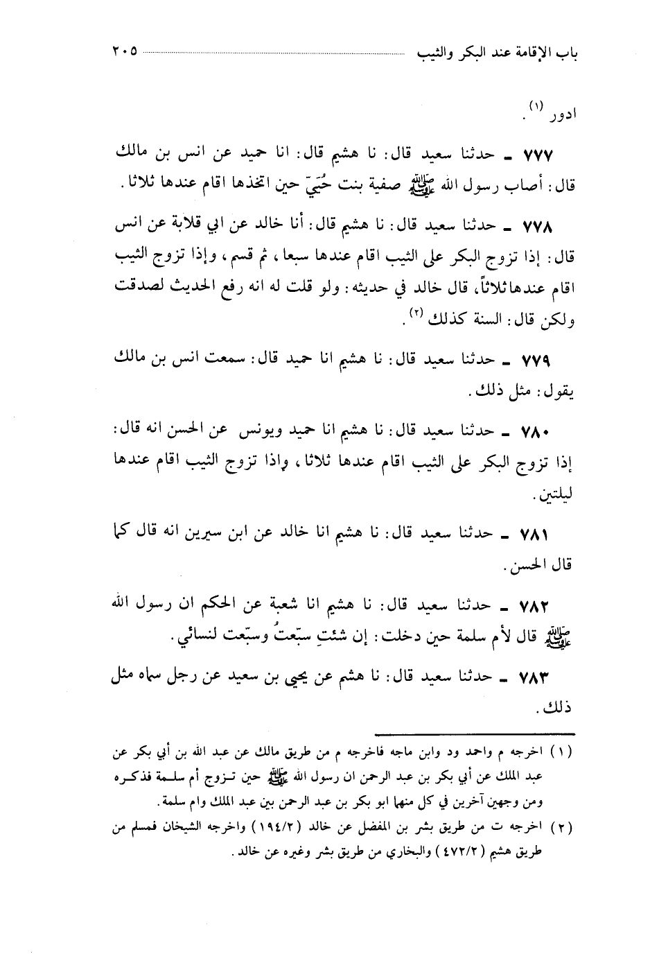 777- حَدَّثَنَا هُشَيْمٌ قَالَ : أَخْبَرَنَا حُمَيْدٌ ، عَنْ أَنَسِ بْنِ مَالِكٍ ، قَالَ : أَصَابَ رَسُولُ اللهِ صَلَّى اللَّهُ عَلَيْهِ وَسَلَّمَ صَفِيَّةَ بِنْتَ حُيَيٍّ حِينَ اتَّخَذَهَا أَقَامَ عِنْدَهَا ثَلاَثًا.