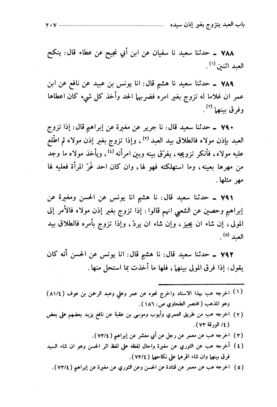 791- حَدَّثَنَا هُشَيْمٌ ، أَخْبَرَنَا يُونُسُ ، عَنِ الْحَسَنِ ، وَمُغِيرَةُ ، عَنْ إِبْرَاهِيمَ ، وَحُصَيْنٌ ، عَنِ الشَّعْبِيِّ ، أَنَّهُمْ قَالُوا : إِذَا تَزَوَّجَ بِغَيْرِ إِذْنِ مَوْلاَهُ فَالأَمْرُ إِلَى الْمَوْلَى ، إِنْ شَاءَ أَنْ يُجِيزَ ، وَإِنْ شَاءَ أَنْ يَرُدَّ ، وَإِذَا تَزَوَّجَ بِأَمْرِهِ فَالطَّلاَقُ بِيَدِ الْعَبْدِ.