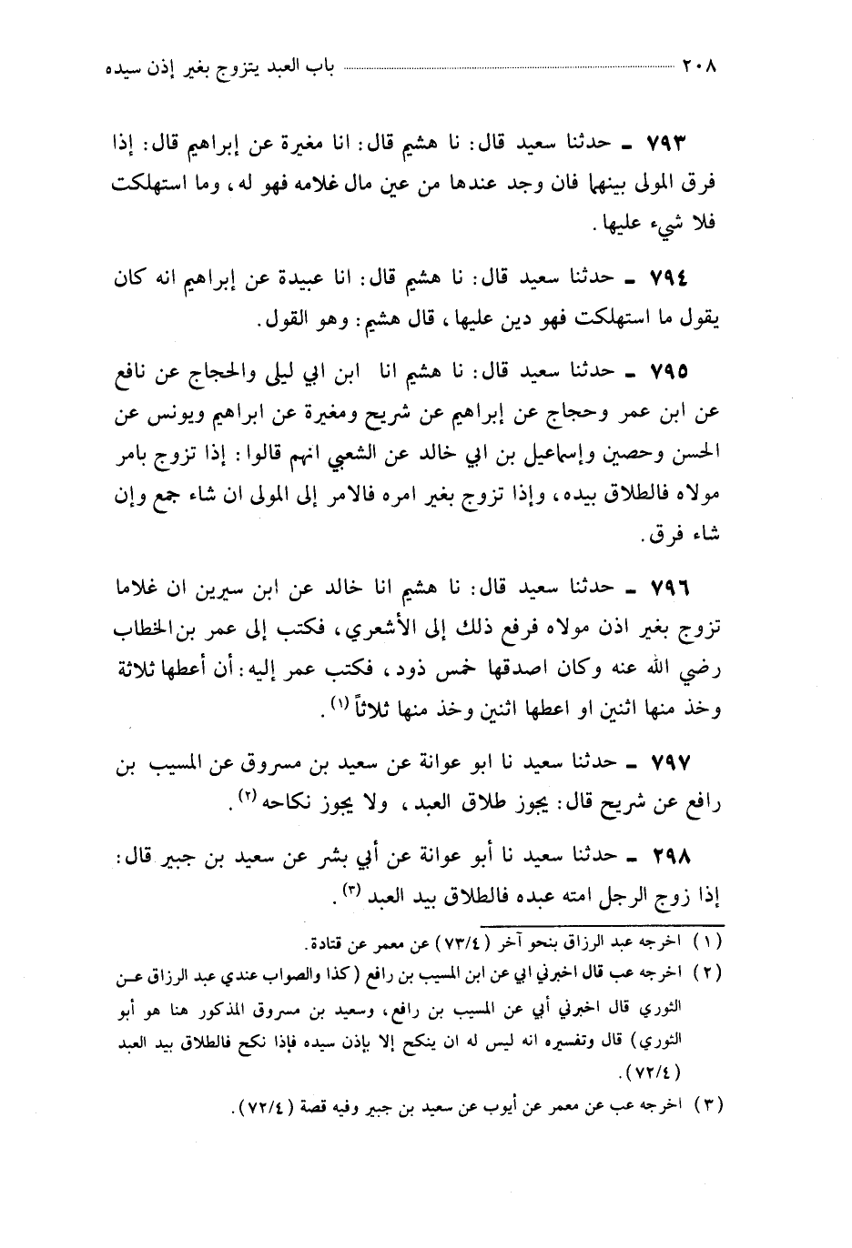 795- حَدَّثَنَا هُشَيْمٌ ، أَخْبَرَنَا ابْنُ أَبِي لَيْلَى ، وَالْحَجَّاجُ ، عَنْ نَافِعٍ ، عَنِ ابْنِ عُمَرَ ، وَحَجَّاجٍ ، عَنْ إِبْرَاهِيمَ ، عَنْ شُرَيْحٍ ، وَمُغِيرَةُ ، عَنْ إِبْرَاهِيمَ ، وَيُونُسُ ، عَنِ الْحَسَنِ ، وَحُصَيْنٌ ، وَإِسْمَاعِيلُ بْنُ أَبِي خَالِدٍ ، عَنِ الشَّعْبِيِّ ، أَنَّهُمْ قَالُوا : إِذَا تَزَوَّجَ بِأَمْرِ مَوْلاَهُ فَالطَّلاَقُ بِيَدِهِ ، وَإِذَا تَزَوَّجَ بِغَيْرِ أَمْرِهِ فَالأَمْرُ إِلَى الْمَوْلَى إِنْ شَاءَ جَمَعَ وَإِنْ شَاءَ فَرَّقَ.