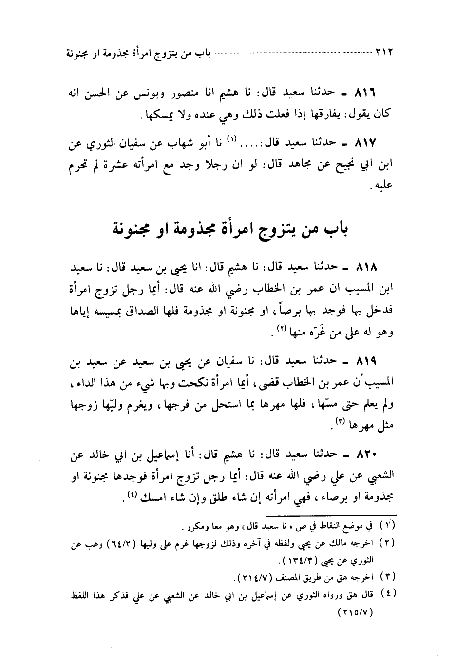 820- حَدَّثَنَا هُشَيْمٌ ، قَالَ : أَخْبَرَنَا إِسْمَاعِيلُ بْنُ أَبِي خَالِدٍ ، عَنِ الشَّعْبِيِّ ، عَنْ عَلِيٍّ ، رَضِيَ اللَّهُ عَنْهُ قَالَ : أَيُّمَا رَجُلٍ تَزَوَّجَ امْرَأَةً ، فَوَجَدَهَا مَجْنُونَةً أَوْ مَجْذُومَةً أَوْ بَرْصَاءَ ، فَهِيَ امْرَأَتُهُ ، إِنْ شَاءَ طَلَّقَ ، وَإِنْ شَاءَ أَمْسَكَ.