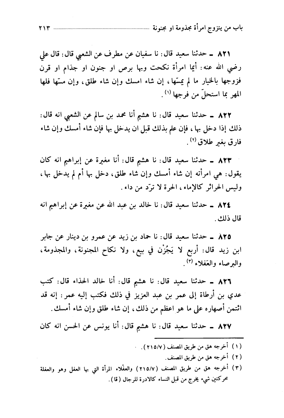 825- حَدَّثَنَا حَمَّادُ بْنُ زَيْدٍ ، عَنْ عَمْرِو بْنِ دِينَارٍ ، عَنْ جَابِرِ بْنِ زَيْدٍ ، قَالَ : أَرْبَعٌ لاَ يُجَزْنَ فِي بَيْعٍ وَلاَ نِكَاحٍ : الْمَجْنُونَةُ ، وَالْمَجْذُومَةُ ، وَالْبَرْصَاءُ ، وَالْعَفْلاَءُ.