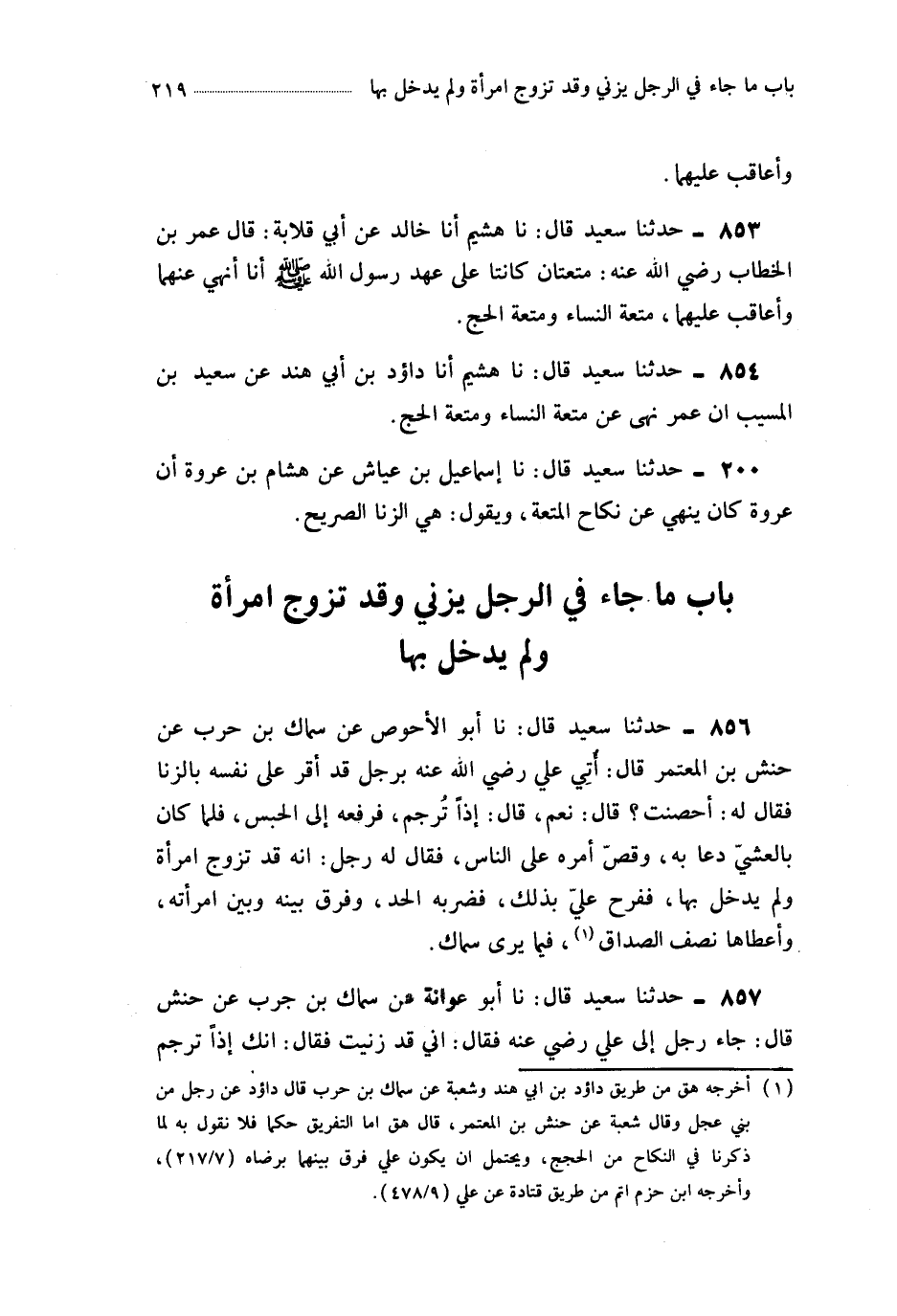 856- حَدَّثَنَا أَبُو الأَحْوَصِ ، عَنْ سِمَاكِ بْنِ حَرْبٍ ، عَنْ حَنَشِ بْنِ الْمُعْتَمِرِ ، قَالَ : أُتِيَ عَلِيٌّ رَضِيَ اللَّهُ عَنْهُ بِرَجُلٍ قَدْ أَقَرَّ عَلَى نَفْسِهِ بِالزِّنَا ، فَقَالَ لَهُ : أَحْصَنْتَ ؟ قَالَ : نَعَمْ . قَالَ : إِذًا تُرْجَمَ . فَرَفَعَهُ إِلَى الْحَبْسِ ، فَلَمَّا كَانَ بِالْعَشِيِّ دَعَا بِهِ ، وَقَصَّ أَمْرَهُ عَلَى النَّاسِ ، فَقَالَ لَهُ رَجُلٌ : إِنَّهُ قَدْ تَزَوَّجَ امْرَأَةً وَلَمْ يَدْخُلْ بِهَا . فَفَرِحَ عَلِيٌّ بِذَلِكَ ، فَضَرَبَهُ الْحَدَّ ، وَفَرَّقَ بَيْنَهُ وَبَيْنَ امْرَأَتِهِ ، وَأَعْطَاهَا نِصْفَ الصَّدَاقِ ، فِيمَا يَرَى سِمَاكٌ.