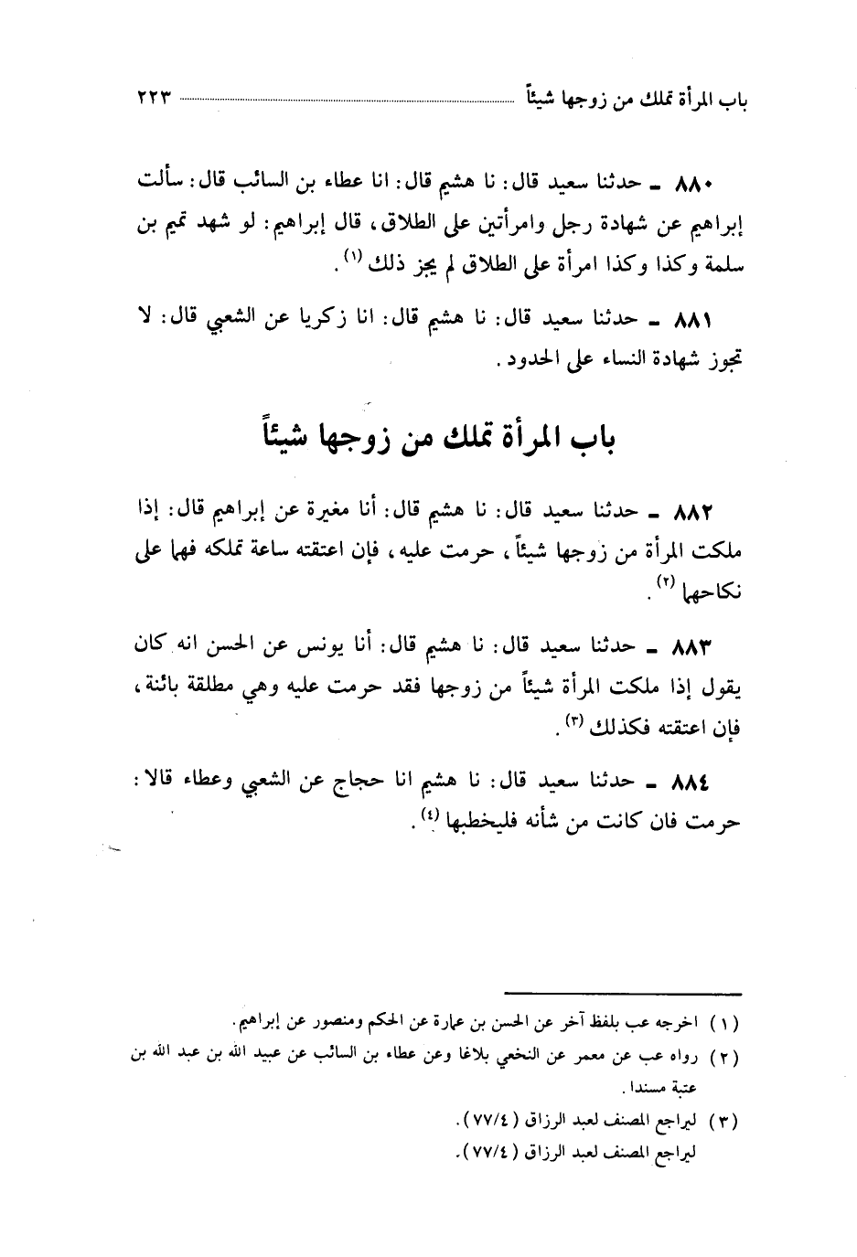 880- حَدَّثَنَا هُشَيْمٌ ، قَالَ : أَخْبَرَنَا عَطَاءُ بْنُ السَّائِبِ ، قَالَ : سَأَلْتُ إِبْرَاهِيمَ عَنْ شَهَادَةِ ، رَجُلٍ وَامْرَأَتَيْنِ عَلَى الطَّلاَقِ ، قَالَ إِبْرَاهِيمُ : لَوْ شَهِدَ تَمِيمُ بْنُ سَلَمَةَ وَكَذَا وَكَذَا امْرَأَةً عَلَى الطَّلاَقِ لَمْ يَجُزْ ذَلِكَ.