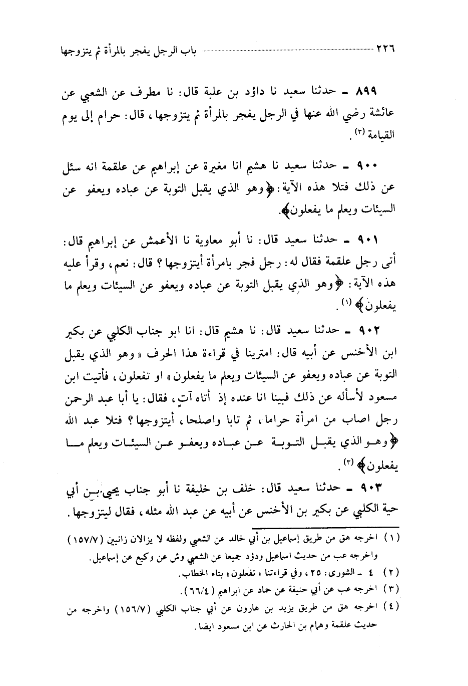 902- حَدَّثَنَا هُشَيْمٌ ، قَالَ : أَخْبَرَنَا أَبُو جَنَابٍ الْكَلْبِيُّ ، عَنْ بُكَيْرِ بْنِ الأَخْنَسِ ، عَنْ أَبِيهِ قَالَ : امْتَرَيْنَا فِي قِرَاءَةِ هَذَا الْحَرْفِ : {وَهُوَ الَّذِي يَقْبَلُ التَّوْبَةَ عَنْ عِبَادِهِ وَيَعْفُو عَنِ السَّيِّئَاتِ وَيَعْلَمُ مَا تَفْعَلُونَ} أَوْ ( يَفْعَلُونَ ) ، فَأَتَيْتُ ابْنَ مَسْعُودٍ لأَسْأَلَهُ عَنْ ذَلِكَ ، فَبَيْنَا أَنَا عِنْدَهُ إِذْ أَتَاهُ آتٍ ، فَقَالَ : يَا أَبَا عَبْدِ الرَّحْمَنِ ، رَجُلٌ أَصَابَ مِنَ امْرَأَةٍ حَرَامًا ، ثُمَّ تَابَا وَأَصْلَحَا ، أَيَتَزَوَّجُهَا ؟ فَتَلاَ عَبْدُ اللهِ : ( وَهُوَ الَّذِي يَقْبَلُ التَّوْبَةَ عَنْ عِبَادِهِ وَيَعْفُو عَنِ السَّيِّئَاتِ وَيَعْلَمُ مَا يَفْعَلُونَ ).
