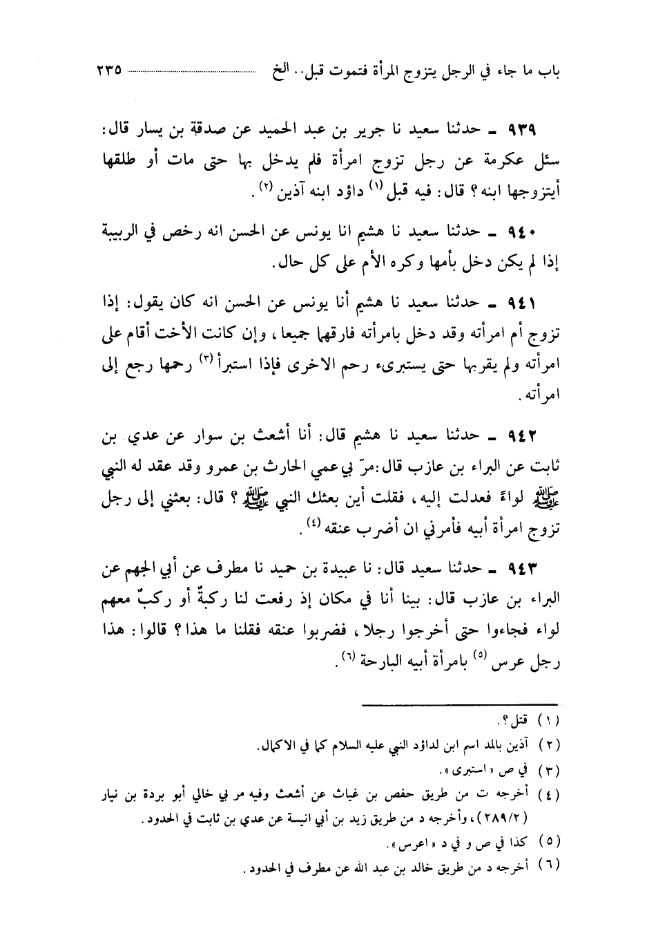 941- حَدَّثَنَا هُشَيْمٌ ، أَخْبَرَنَا يُونُسُ ، عَنِ الْحَسَنِ ، أَنَّهُ كَانَ يَقُولُ : إِذَا تَزَوَّجَ أُمَّ امْرَأَتِهِ وَقَدْ دَخَلَ بِامْرَأَتِهِ فَارَقَهُمَا جَمِيعًا ، وَإِنْ كَانَتِ الأُخْتُ أَقَامَ عَلَى امْرَأَتِهِ وَلَمْ يَقْرَبْهَا حَتَّى يَسْتَبْرِئَ رَحِمَ الأُخْرَى ، فَإِذَا اسْتَبْرَأَ رَحِمَهَا رَجَعَ إِلَى امْرَأَتِهِ.