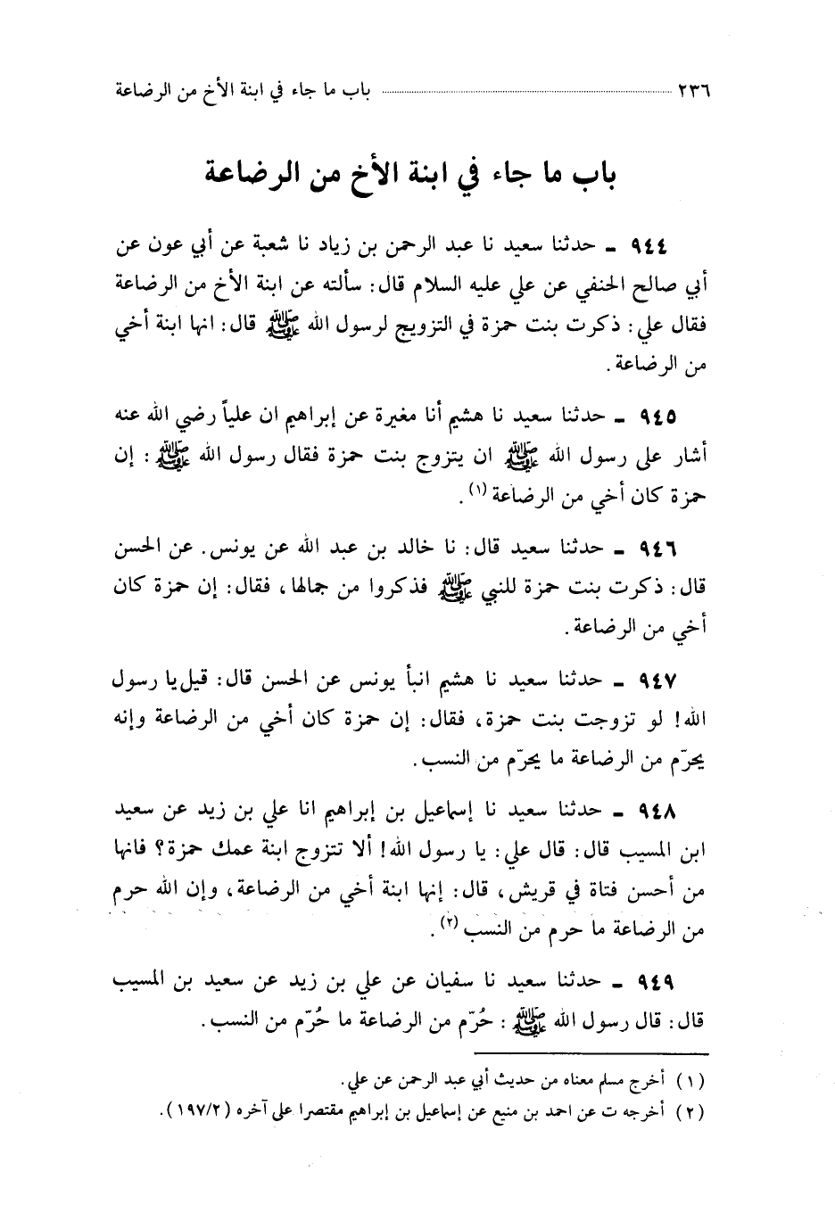 945- حَدَّثَنَا هُشَيْمٌ ، أَخْبَرَنَا مُغِيرَةُ ، عَنْ إِبْرَاهِيمَ ، أَنَّ عَلِيًّا ، رَضِيَ اللَّهُ عَنْهُ أَشَارَ عَلَى رَسُولِ اللهِ صَلَّى اللَّهُ عَلَيْهِ وَسَلَّمَ أَنْ يَتَزَوَّجَ بِنْتَ حَمْزَةَ ، فَقَالَ رَسُولُ اللهِ صَلَّى اللَّهُ عَلَيْهِ وَسَلَّمَ : إِنَّ حَمْزَةَ كَانَ أَخِي مِنَ الرَّضَاعَةِ.