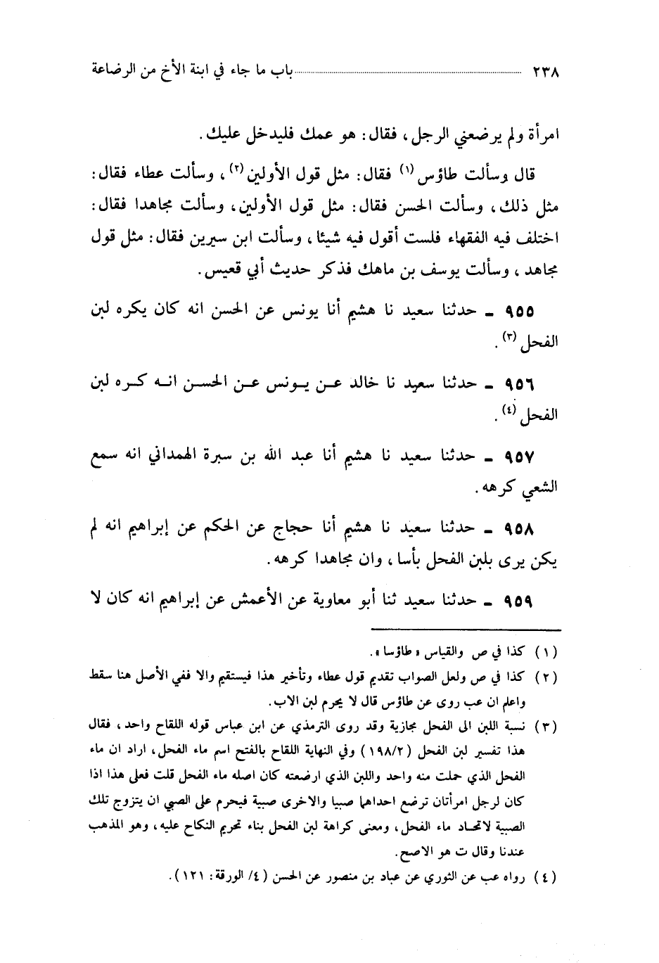 959- حَدَّثَنَا أَبُو مُعَاوِيَةَ ، عَنِ الأَعْمَشِ ، عَنْ إِبْرَاهِيمَ أَنَّهُ كَانَ لاَ يَرَى بِلَبَنِ الْفَحْلِ بَأْسًا.
