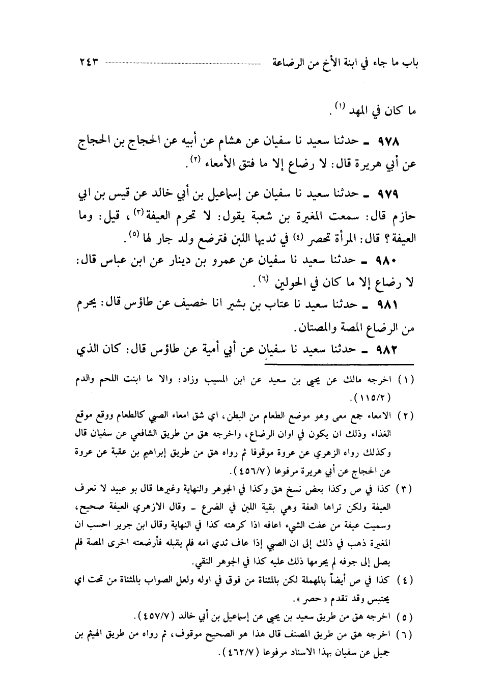 978- حَدَّثَنَا سُفْيَانُ ، عَنْ هِشَامٍ ، عَنْ أَبِيهِ ، عَنِ الْحَجَّاجِ بْنِ الْحَجَّاجِ ، عَنْ أَبِي هُرَيْرَةَ ، قَالَ : لاَ رَضَاعَ إِلاَّ مَا فَتَقَ الأَمْعَاءَ.