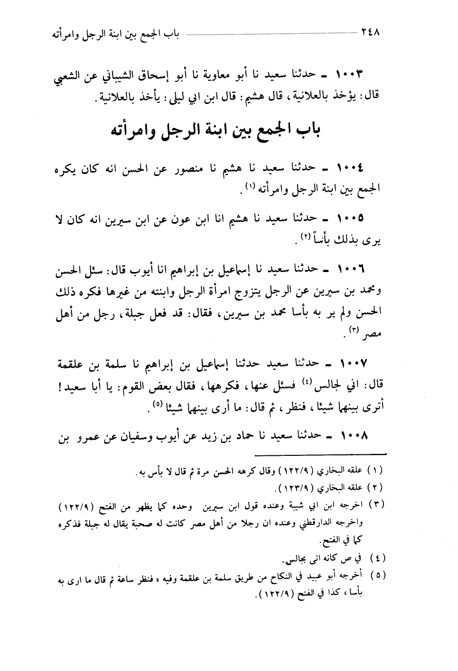1006- حَدَّثَنَا إِسْمَاعِيلُ بْنُ إِبْرَاهِيمَ ، أَخْبَرَنَا أَيُّوبُ ، قَالَ : سُئِلَ الْحَسَنُ وَمُحَمَّدُ بْنُ سِيرِينَ عَنِ الرَّجُلِ يَتَزَوَّجُ امْرَأَةَ الرَّجُلِ وَابْنَتَهُ مِنْ غَيْرِهَا ، فَكَرِهَ ذَلِكَ الْحَسَنُ ، وَلَمْ يَرَ بِهِ بَأْسًا مُحَمَّدُ بْنُ سِيرِينَ ، فَقَالَ : قَدْ فَعَلَ جَبَلَةُ ، رَجُلٌ مِنْ أَهْلِ مِصْرَ.