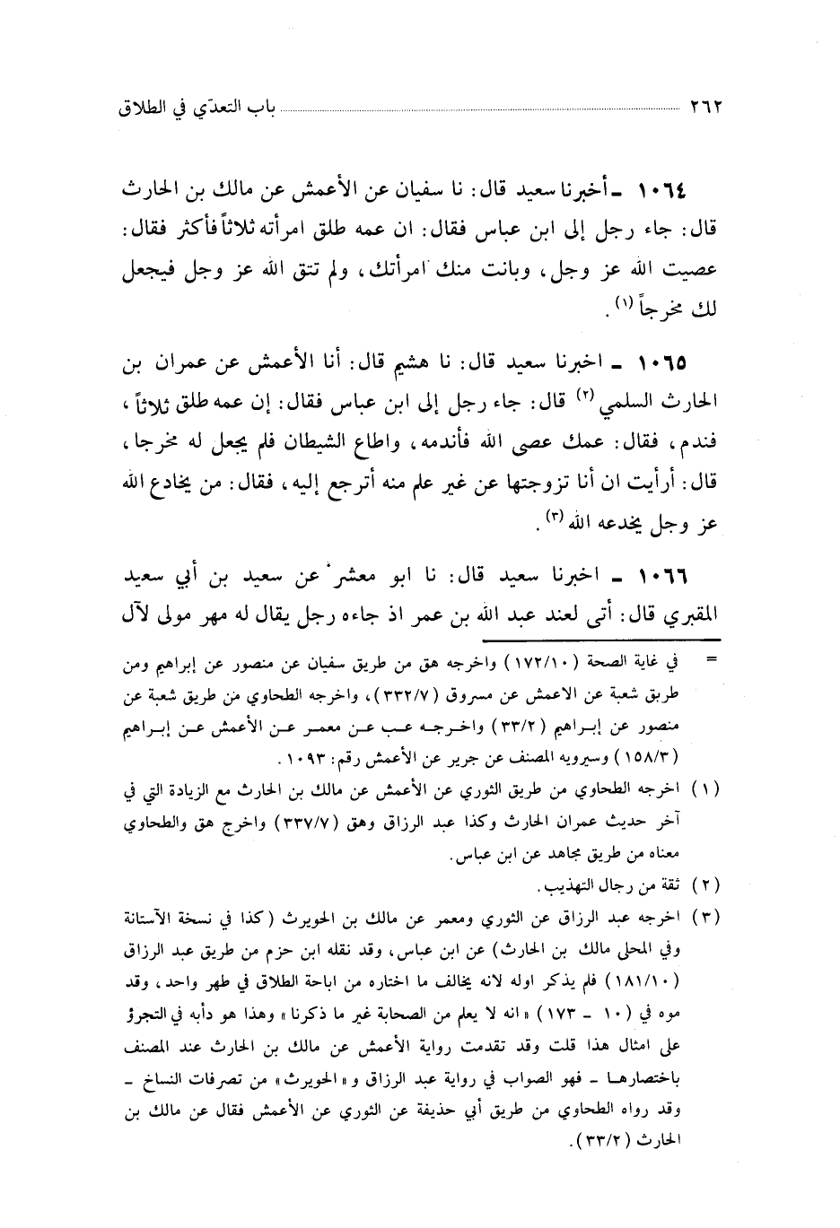 1064- أَخْبَرَنَا سَعِيدٌ قَالَ : حَدَّثَنَا سُفْيَانُ ، عَنِ الأَعْمَشِ ، عَنْ مَالِكِ بْنِ الْحَارِثِ ، قَالَ : جَاءَ رَجُلٌ إِلَى ابْنِ عَبَّاسٍ ، فَقَالَ : إِنَّ عَمَّهُ طَلَّقَ امْرَأَتَهُ ثَلاَثًا فَأَكْثَرَ . فَقَالَ : عَصَيْتَ اللَّهَ عَزَّ وَجَلَّ ، وَبَانَتْ مِنْكَ امْرَأَتُكَ ، وَلَمْ تَتَّقِ اللَّهَ عَزَّ وَجَلَّ فَيَجْعَلَ لَكَ مَخْرَجًا.