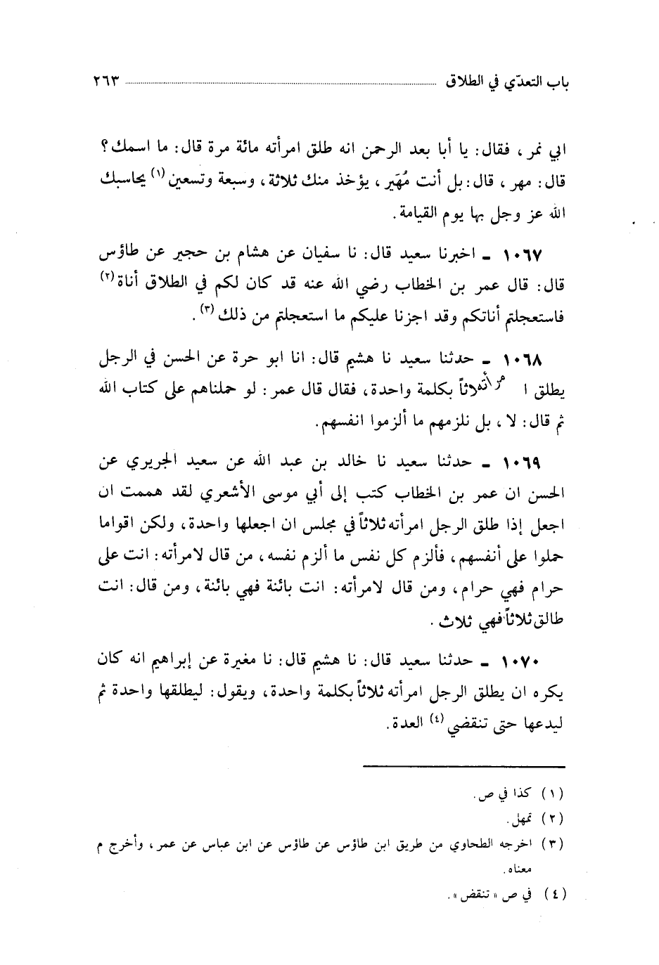 1068- حَدَّثَنَا هُشَيْمٌ ، قَالَ : أَخْبَرَنَا أَبُو حُرَّةَ ، عَنِ الْحَسَنِ فِي الرَّجُلِ يُطَلِّقُ امْرَأَتَهُ ثَلاَثًا بِكَلِمَةٍ وَاحِدَةٍ ، فَقَالَ : قَالَ عُمَرُ : لَوْ حَمَلْنَاهُمْ عَلَى كِتَابِ اللهِ . ثُمَّ قَالَ : لاَ ، بَلْ نُلْزِمُهُمْ مَا أَلْزَمُوا أَنْفُسَهُمْ.